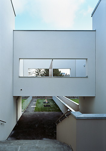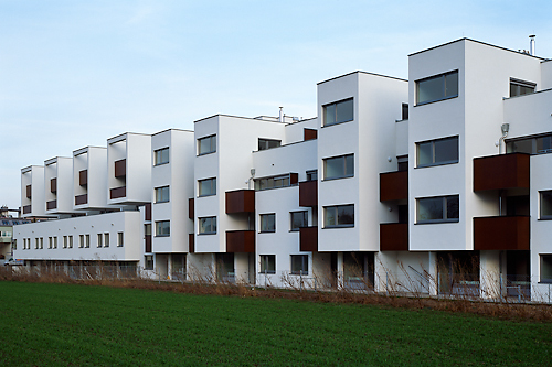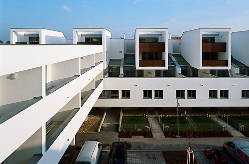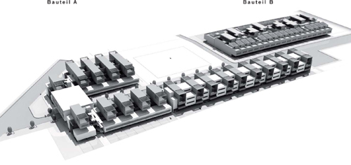 Der Split-Atriumtyp des Bauteil A wird in der Zeile gespiegelt und bildet Rücken an Rücken einen 30 m tiefen, 2,5-geschossigen Siedlungskörper. Die unteren Split-Atrium-Wohnungen (102 qm mit zentralem Lichthof und 24 qm Dachterrassen) haben direkte Eingänge im Erdgeschoss und Einzelgaragen darunter. In den beiden Dachgeschossen werden durchgesteckte Split-Maisonetten (116 qm auf vier Ebenen) zwischen den Doppelatrien aufgesetzt. Diese Dachmaisonetten werden über einen gedeckten Laubengang im ersten Dachgeschoss erschlossen. In beiden Bauteilen konnte trotz hoher Dichte die Privatheit der Einzelwohnung durch eine klare vertikale Trennung der Häuser erreicht werden. Mehrgeschossige Atrien, Lichthöfe, gedeckte und offene Terrassen, Dachgärten mit Humusaufbau sowie Dachatrien schaffen ein der Stadtrandlage entsprechendes Freiraumangebot. Mit größerer Privatsphäre kann man Schulter an Schulter nicht wohnen. Das Projekt wurde noch in der Bauphase mit dem 1. Preis des Österreichischen Baupreises 2008 ausgezeichnet. (Text: Gabriele Kaiser)