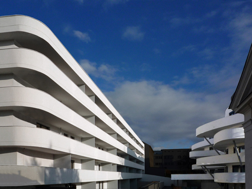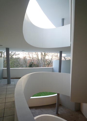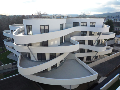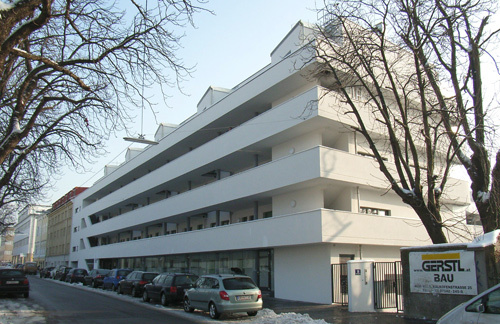 Jede Ebene des tanzenden Baukörpers (dessen Tragstruktur aus 2 Ellipsoiden und einer Nierenform besteht) ist anders konfiguriert und verfügt über teilweise gedeckte, teilweise ausschwingende Terrassenflächen, bei denen die Baumkronen zum Greifen nahe rücken. Schrägstehende Schleuderbetonstützen tragen die Auskragungen, das offene Stiegenhaus wirkt wie eine begehbare Skulptur, die die elliptischen „Eigenheime“ (durchgehende Raumhöhe 2,75 m) lose miteinander verbindet. Da die Stahlbetonkonstruktion aufgrund der lockeren Baukörperkonfiguration über einen hohen Außenwandanteil verfügt, musste das Niedrigenergiehaus mit entsprechend höherem Aufwand isoliert werden. (Zwischen Geschossdecke und Terrassenplatte wurden Hunderte von Isokörben eingebaut, die Wärmedämmplatten sind mit der Fräse der Geometrie des Gebäudes angepasst worden.) Auf die äußerliche Nobilitierung durch edle Materialien kann dieser Wohnbau getrost verzichten, besteht doch sein eigentlicher Luxus in einem profunden und poetischen Raumkonzept, für das es im Wiener Wohnungsbau wohl kaum ein Vergleichsbeispiel gibt. (Text: Gabriele Kaiser)