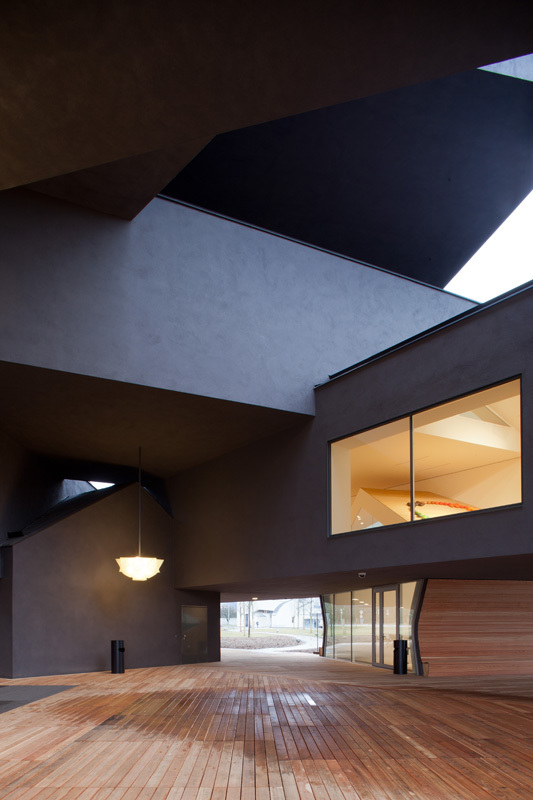 Bereits in einem frühen Entwicklungsstadium des Projektes waren sich die Ingenieure einig, dass die Tragkonstruktion des komplexen Gebäudes nur funktionieren kann, wenn jeder einzelne hausförmige Querschnitt – bestehend aus einem Giebeldach, zwei Wänden und einem Boden – als Rohr verstanden wird. Rohre zeichnen sich durch eine hohe Stabilität aus und ermöglichen bei diesem Projekt eine elegante Ableitung des komplexen Kräfteflusses. Dieser tragwerksplanerische Ansatz ermöglichte es, die von den Architekten im Entwurf vorgesehenen Auskragungen, Überbrückungen und Durchtrennungen der einzelnen Baukörper in die Realität umzusetzen. In einem weiteren Schritt untersuchten und verglichen die Bauingenieure verschiedene Materialien. Sie studierten Tragwerksvarianten aus Stahl, Beton und Holz. Der Entscheid, das Tragwerk aus Beton zu konstruieren, fiel aufgrund der amorphen Materialeigenschaft von Beton: Da er gegossen wird, kann Beton in beinahe jede beliebige Form gebracht werden. Das ingenieurspezifische Konzept der Rohrkonstruktion liess sich somit gegenüber Varianten in Stahl und Holz, die mehrheitlich noch als lineare Tragkonstruktionen eingesetzt werden, mit reduziertem Aufwand umsetzen: Es wurde sozusagen «den Kräften entsprechend betoniert».