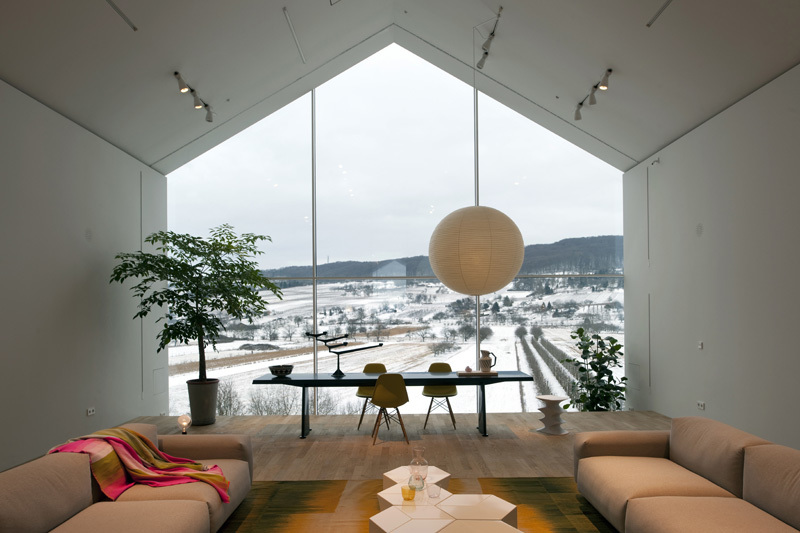 Für die Präsentation von Designermöbeln stand auf dem Vitra Campus in Weil am Rhein (D) bisher kein Raum zur Verfügung. Deshalb erhielten die Basler Architekten Herzog & de Meuron im Jahr 2006 den Auftrag, das VitraHaus zu entwerfen und damit den laufend erweiterten Architektur-Campus um ein Gebäude zu ergänzen (vgl. Kasten, S. 25). Es steht im Norden des Areals inmitten der landschaftsprägenden Streuobstwiesen (Abb. 1 und 4).