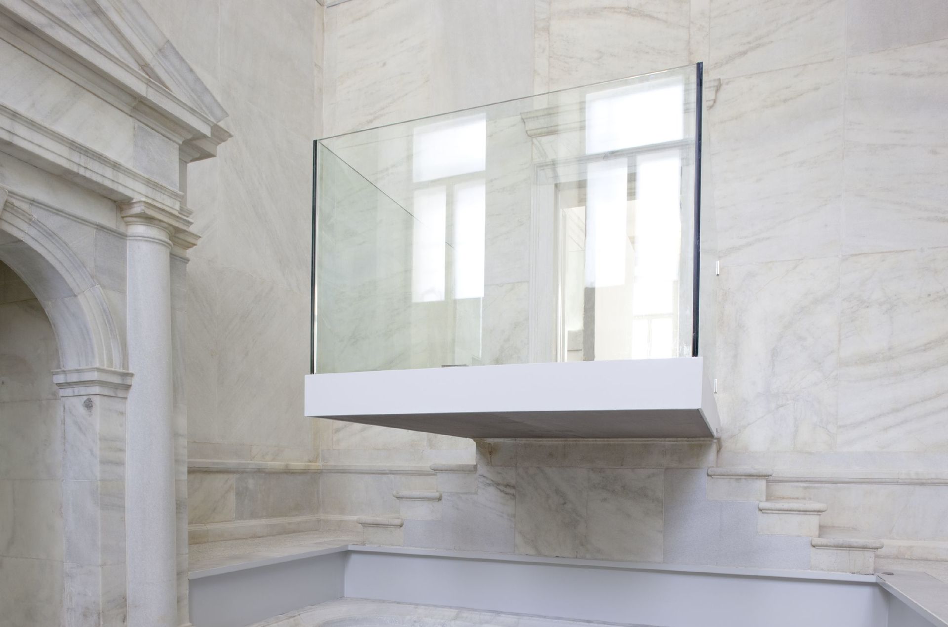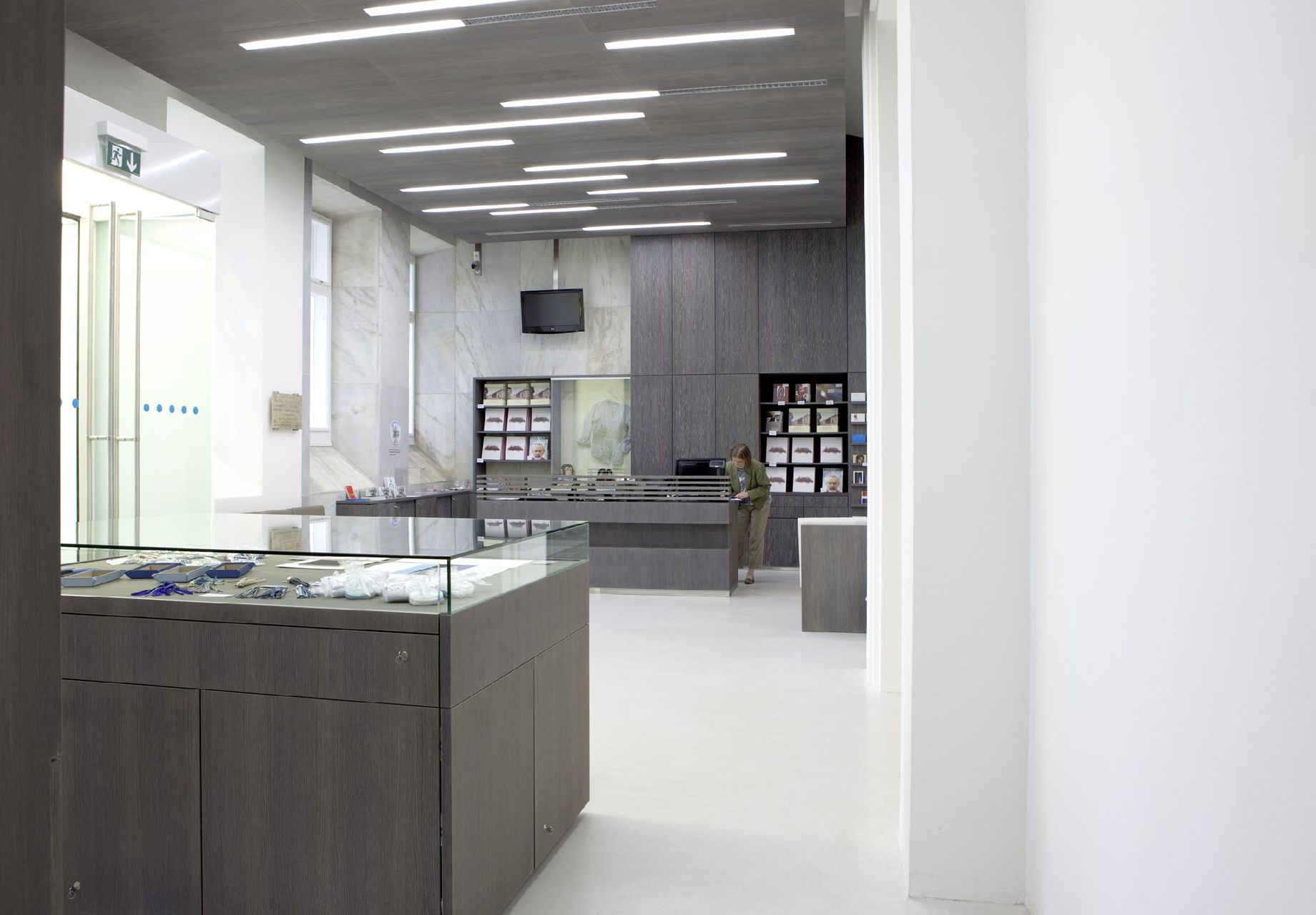 In das Foyer, wo neue Infrastruktur für Kassen, Shop und Garderobe nötig war, stellten die Architekten eine Baldachin-Konstruktion in weiß gewachster Mooreiche. Die fahle Farbe und die haptische Materialität des Holzes ziehen sich durch das ganze Haus und kennzeichnen die zeitgenössischen Eingriffe, die hauptsächlich der Erschließung der Ausstellungsräume dienen. Die zurückgenommene Farbigkeit des Holzes korrespondiert hier mit den kühlen, noblen Marmorwänden der Becken und den neuen, weißen Terrazzoböden. Das im „Stundenbad“, einem kleinen Extrabecken, erhaltene alte Bodenmosaik blieb unangetastet.