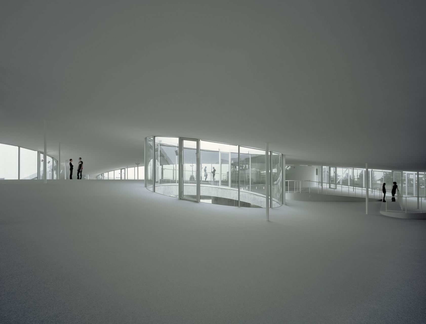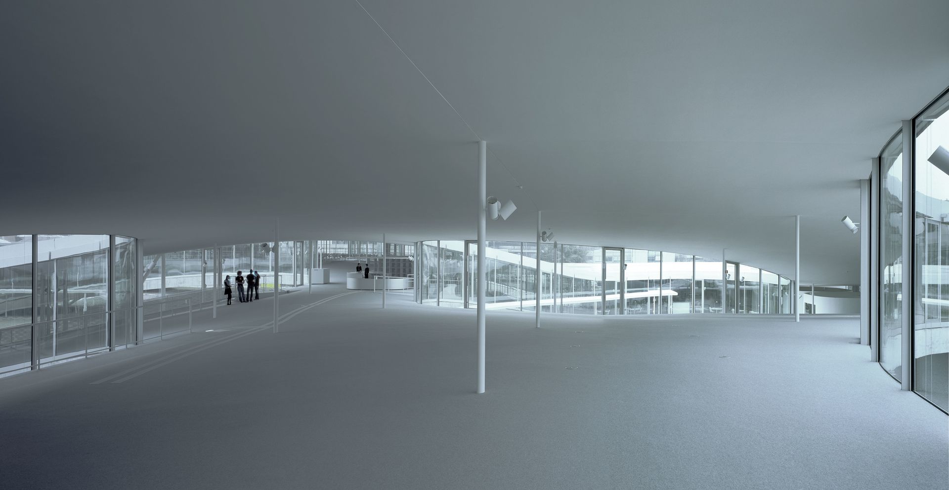 „Wir wollten einen einzigen offenen Raum auf einer Etage schaffen“, sagt Sejima, „das ermöglicht eine ganz andere, hierarchielosere Kommunikation als etwa ein Gebäude mit voneinander getrennten Stockwerken, mit ganz normalen Gängen und Zimmern.“ Durch die Belebung der Topografie, durch das Auf- und Abwiegen der 3,50 Meter hohen Innenräume sieht man selbst aus dem Zentrum des Gebäudes auf den See hinaus. An schönen Tagen reicht der Blick bis zum schneebedeckten Alpenkamm.