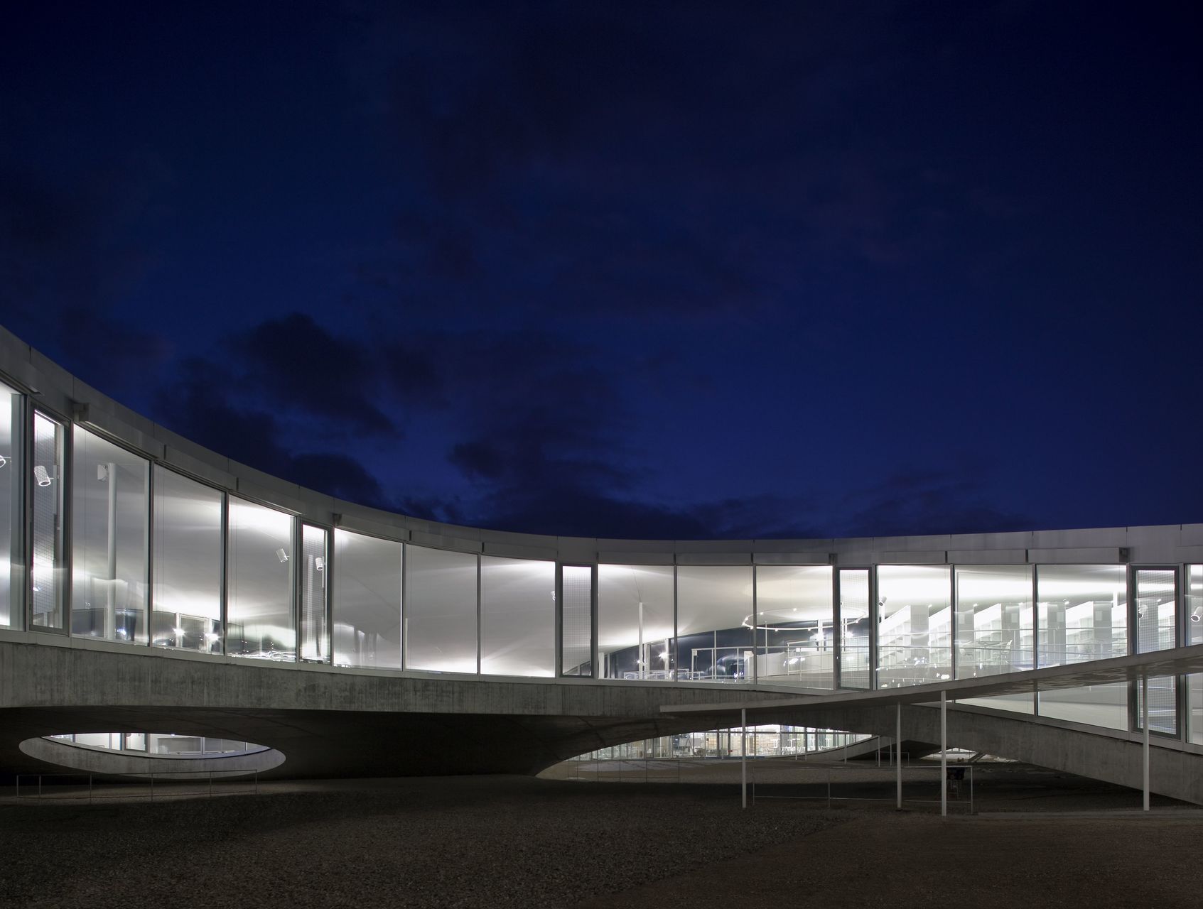 Der Komplex erstreckt sich über drei Ebenen: Auf dem Dach der Tiefgarage liegt ein öffentlich zugänglicher, weiter und offener Raum. Er wird von der wellen- und wabenförmigen Betonschale des eingeschossigen Baus überspannt, den lichtdurchflutete, ovale Innenhöfe erhellen.