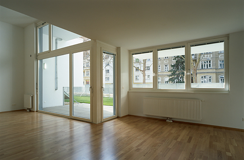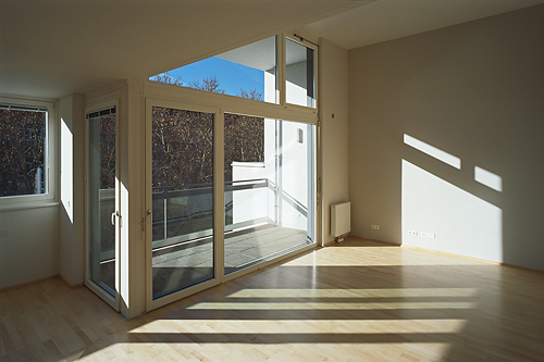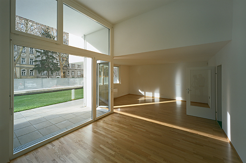 Der Vorgartentrakt weist spezielle Splitleveltypen auf, die eine Mischung aus Flatwohnungen und Maisonetten darstellen. Zu einem hohen Prozentsatz gibt es hier Wohnungen mit wechselweise eineinhalb geschossig hohen und durchgesteckten Wohnzimmern. Die halbgeschossig versetzten und überhohen, vorgelagerten Loggien, die aus dem rhythmischen Wechsel von unterschiedlichen Raumhöhen entstehen, schaffen ein überaus lebendiges und plastisches Fassadenbild.
