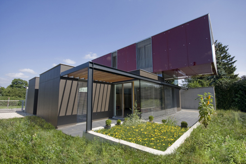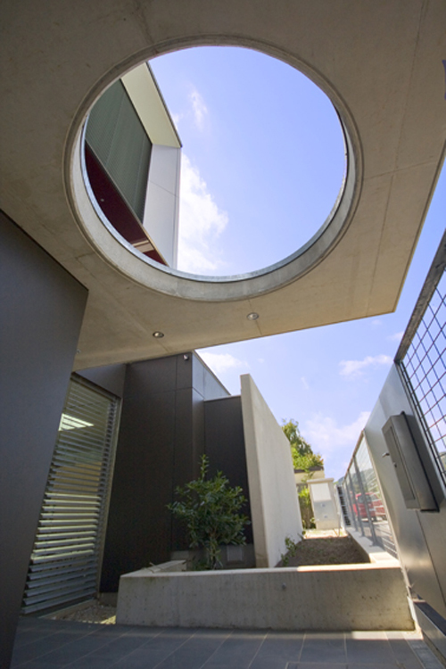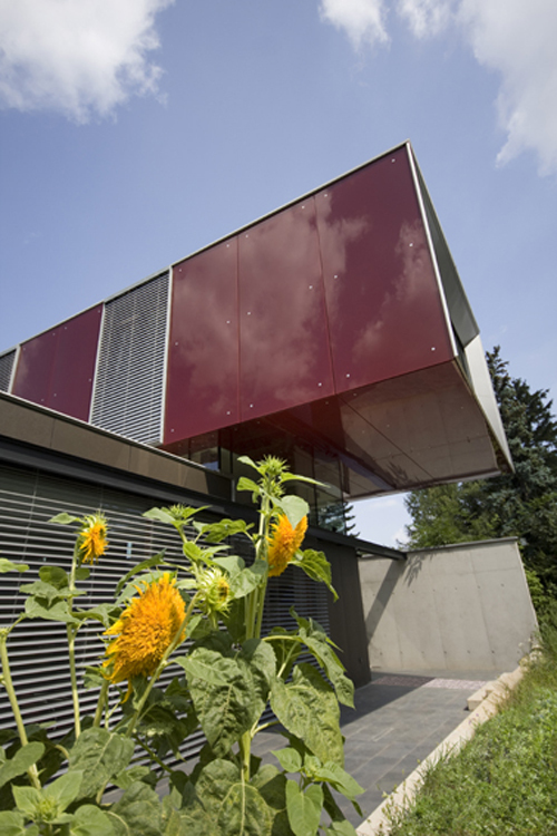Dem Schlafzimmer der Eltern ist eine süd/ostseitige Terrasse vorgelagert, welche durch eine Holzpergola und ein Pflanzbecken von der Hauptterrasse als eigener räumlicher Bereich abgetrennt ist. Diese Zwischen-Zone dient auch dazu, in heißen Sommern eine einfach zu regulierende Klimapufferzone zum Schlafraum zu schaffen.