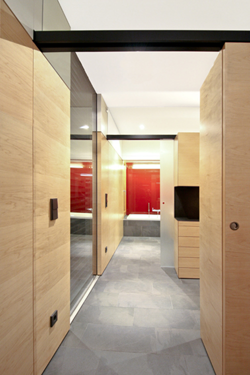 Vom Eingang weg werden durch ein Spiel mit den Raumhöhen (2,5 – 3,8 m) Schwellen erzeugt, die größtenteils den Entfall von Raumabschlüssen ermöglichen, um zugleich einen fortwährenden Raumfluss zu gewährleisten. So gibt es zum Beispiel zwischen Essbereich und Wohnraum keine Wände und Türen – die Räume sind voneinander lediglich durch einen Höhensprung von ca. 1 m in der Decke optisch getrennt und verschmelzen zu einem großzügigen gemeinsamen Raum mit unterschiedlichen Zonierungen.