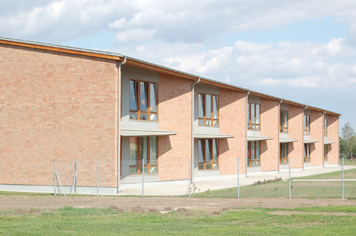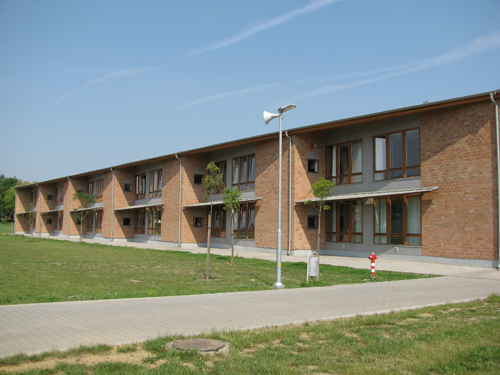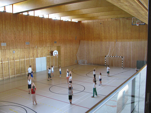In the beginning we planned the entrance hall in bigger dimensions than we decided to save some place and re-created the space by opening the side of the sports hall toward the entrance with window surfaces and sliding doors. The multifunctional hall is the biggest common space of the village so it has to suit these requirements. We made more toilets for the communal use with a disabled one. There’s a sliding plank to protect the hall's special floor and a mobile stage with segments that can be also used as ball tables. The changing rooms are designed with clean-path system, so from them one can go straight to the sports hall.