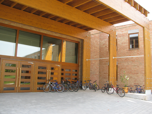 This building has two wings: the sports hall and the school. They are connected with an entrance hall, the main entrance is assigned by a symbolic gate which is remarkable from the main square.