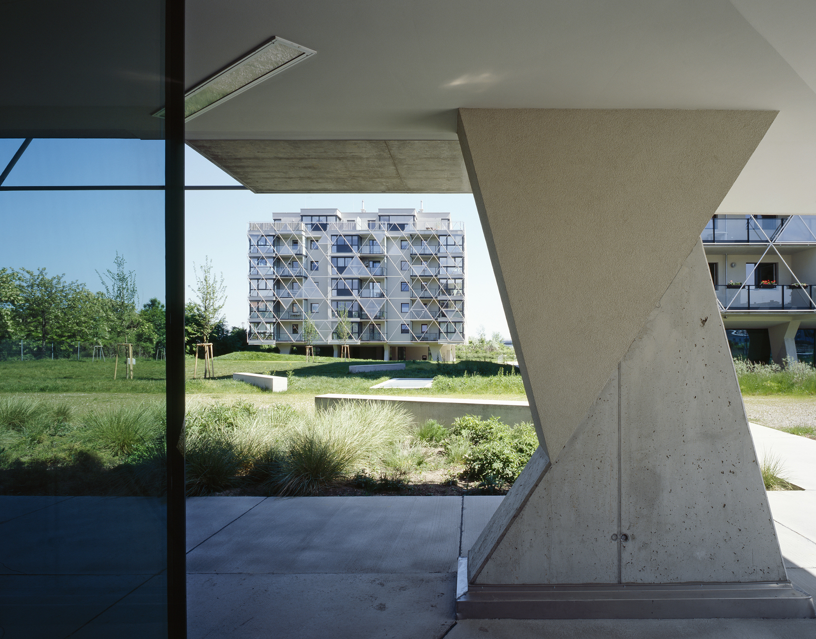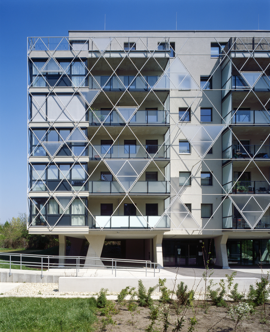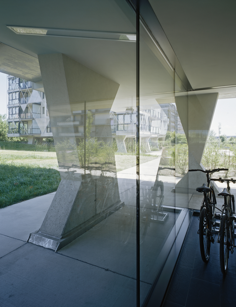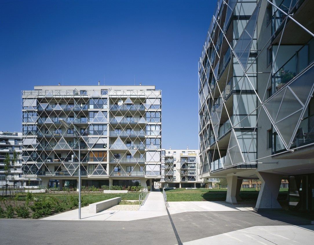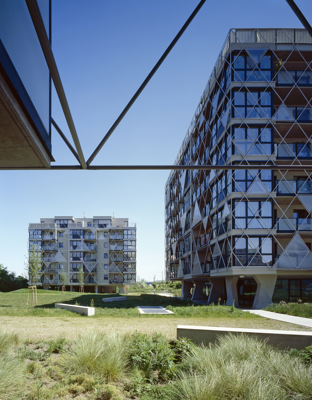 Die insgesamt 118 Wohnungen (50–113m²) der drei freistehenden Punkthäuser im Bauteil C von Elsa Prochazka am nordöstlichen Rand des Areals sind großteils übereck situiert und mit geräumigen Loggien ausgestattet. Die diagonale Raumachse (ein übereck verglaster Wohnraum mit Bezug zu den Loggien schiebt sich an die Gebäudeaußenkante hinaus) sorgt im Vergleich zu herkömmlichen Standardgrundrissen für eine gesteigerte Wahrnehmung des in diesem Fall tatsächlich sehenswerten Stadtraums rundum. Die kompakten Baukörper wirken dank des freigespielten Erdgeschosses schlanker als sie sind, sie öffnen sich mit Gemeinschaftsräumen (Waschküche, Fahrradabstellraum, Spielzimmer, Mehrzeckraum) zur parkartigen ehemaligen Donauuferlandschaft, die das gesamte Wohnareal durchzieht. Die Punkthäuser mit gut belichteter zentraler Erschließung wurden mit ihrer vielfach reflektierenden Oberfläche aus diagonal verspannten Metallelementen und oszillierenden Kunststoffflächen vor den Loggien als glitzernde „Kristalle“ konzipiert, die das wechselnde Umgebungslicht spiegeln und so zu einem Teil der Grünraums werden. Ihre punktuelle Ausfachung mit Doppelstegplatten schafft auf den geräumigen Loggien sichtgeschützte Bereiche. Man fragt sich, warum es für den städtischen Bautypus „Punkthaus“ in Wien bislang so wenig Beispiele gab. (Text: Gabriele Kaiser)