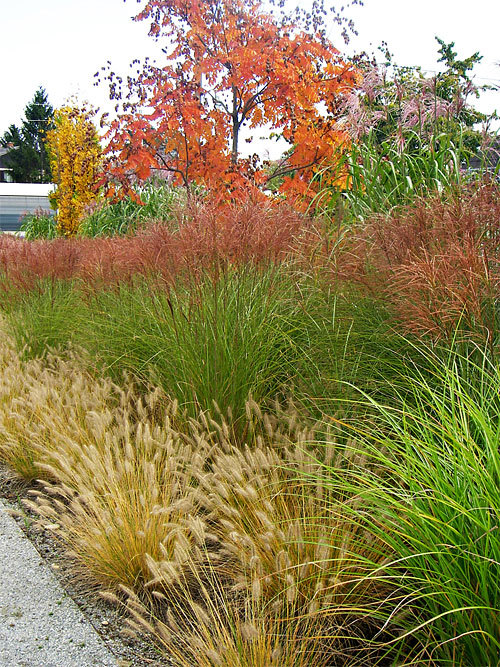 Die Bepflanzung erfolgte durch Gräser-, Stauden-, Strauch- und Zwiebelpflanzungen. Geachtet wurde dabei auf möglichst pflegeextensive und maschinenschnittverträgliche Pflanzflächen, um einen ganzjährigen ästhetischen Aspekt zu gewährleisten. Eine Besonderheit sind jene Flächen, die mit trockenrestistenten Ansaaten – so genannten Ökotypensaaten – in entsprechenden Farbzusammensetzungen versehen wurden. Diese Wildblumenansaaten wurden passend zum pannonisch-illyrischen Klima der Region ausgewählt. Wo es die Platzverhältnisse zulassen, wurden die Objektknotenpunkte mit einer eigenen säulenförmigen Baumart in Reihenform bepflanzt: Säuleneiche, Säulenkirsche und schlankkronige Ginkgo wechseln sich, je nach Abschnitt entlang der Bahnstrecke, ab.