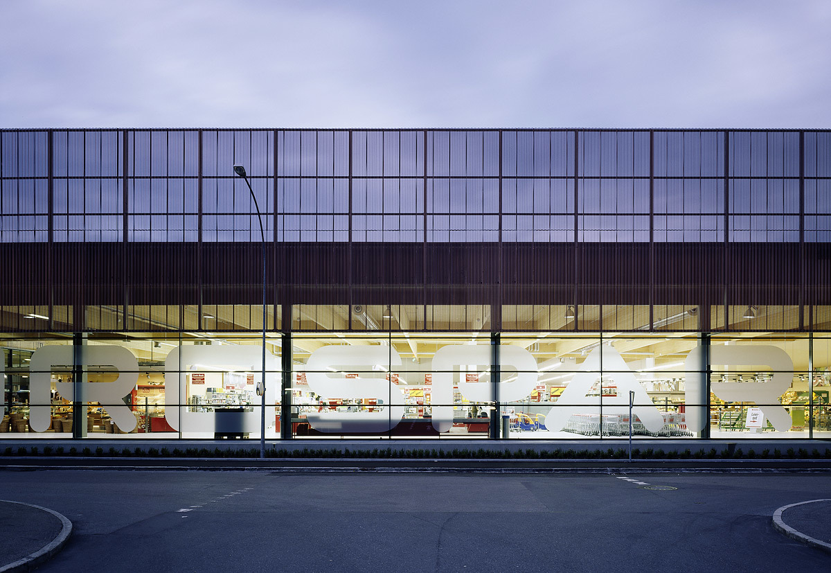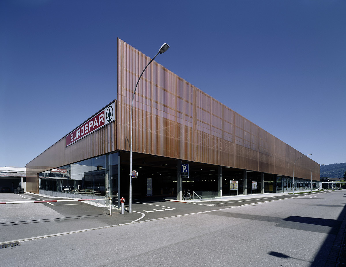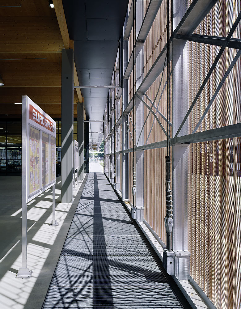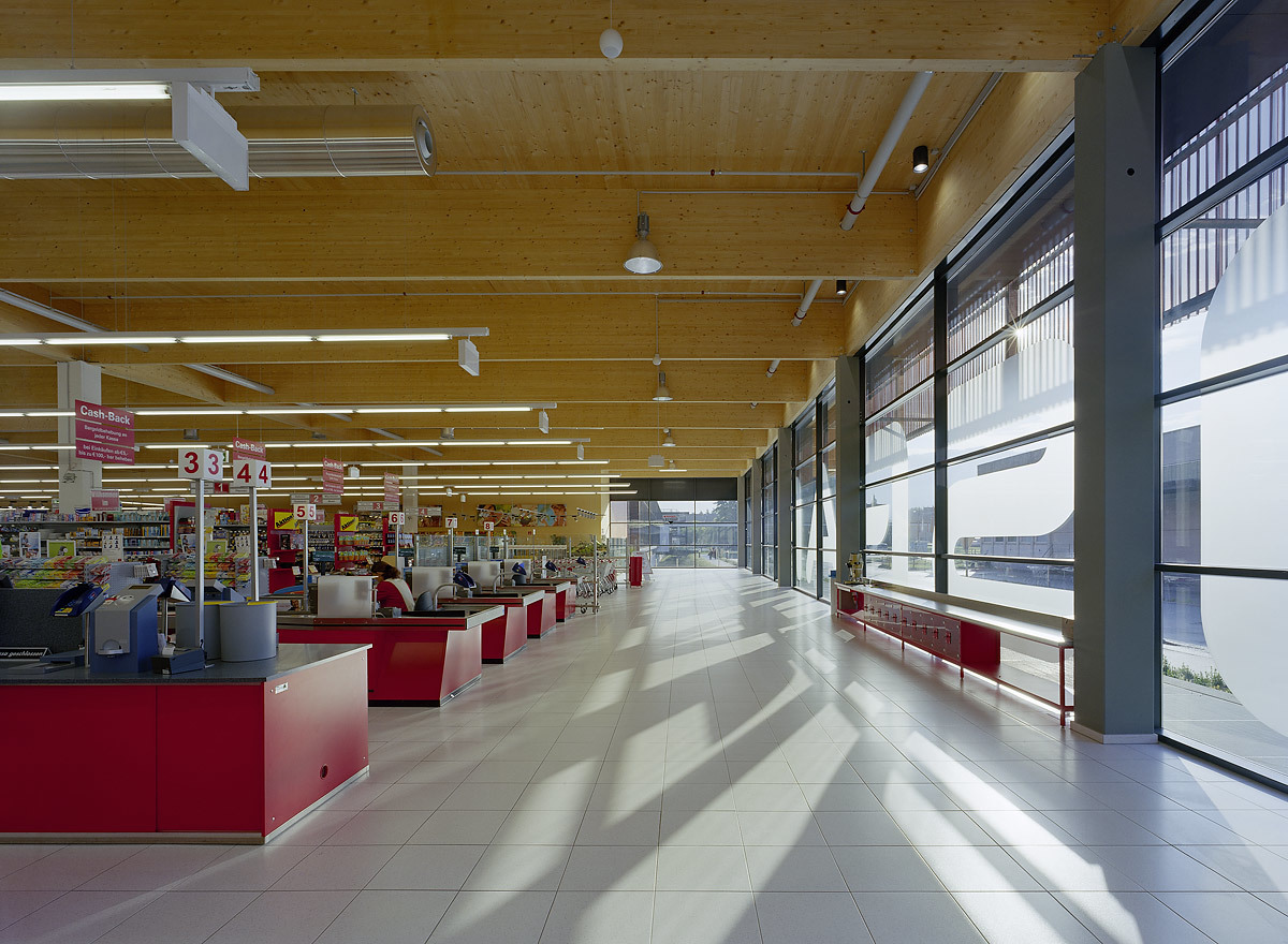 Die Konstruktion des eingeschossigen Bauwerks basiert auf einem weitmaschigen Stützenraster von etwa 12 mal 16 Metern, der in der Verkaufshalle durch die schlanken Dimensionen kaum in Erscheinung tritt. Das Dach bilden schmale, hohe Träger aus Brettschichtholz, auf denen die Decke aus massivem Fichtenholz liegt. Das Holz braucht nicht weiter verkleidet werden, die sparsam und akkurat gesetzten Installationen für Beleuchtung, Belüftung und Sicherheitstechnik treten ob der Klarheit der Tragstruktur in den Hintergrund. (Text: Martina Pfeifer Steiner)