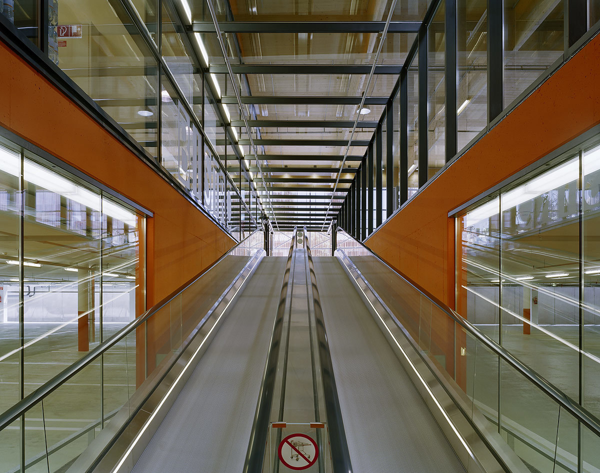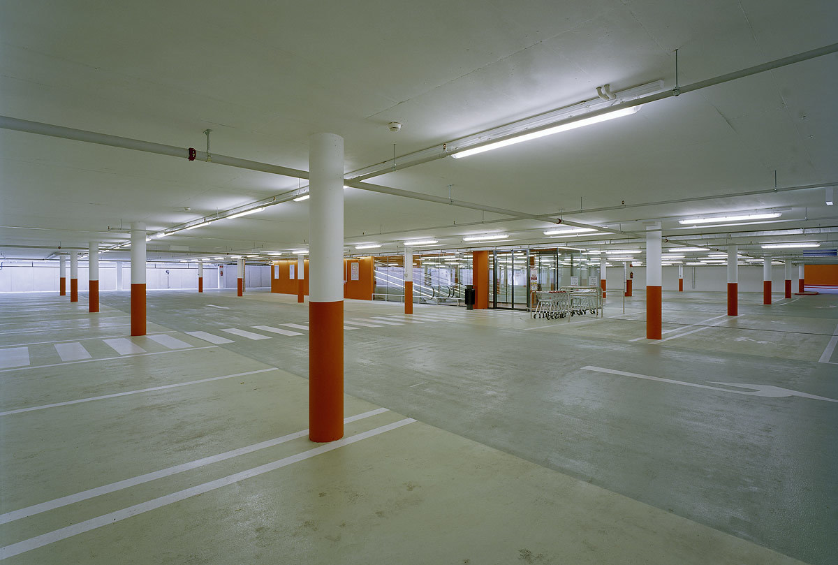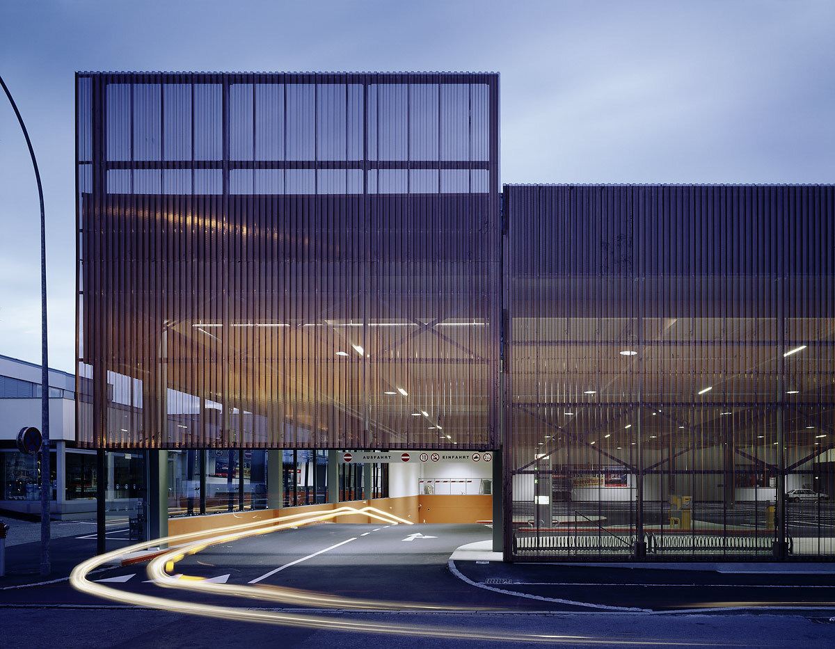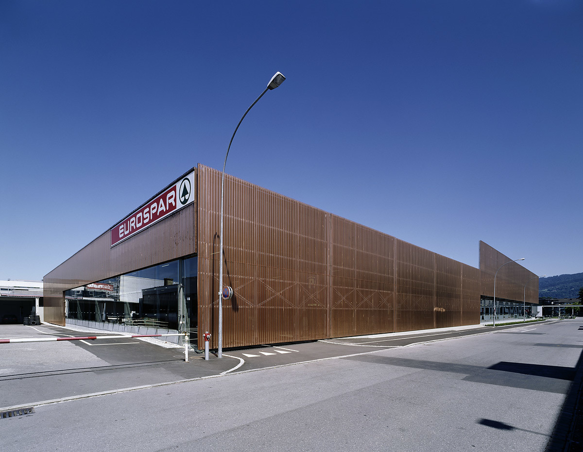 Die Konstruktion des eingeschossigen Bauwerks basiert auf einem weitmaschigen Stützenraster von etwa 12 mal 16 Metern, der in der Verkaufshalle durch die schlanken Dimensionen kaum in Erscheinung tritt. Das Dach bilden schmale, hohe Träger aus Brettschichtholz, auf denen die Decke aus massivem Fichtenholz liegt. Das Holz braucht nicht weiter verkleidet werden, die sparsam und akkurat gesetzten Installationen für Beleuchtung, Belüftung und Sicherheitstechnik treten ob der Klarheit der Tragstruktur in den Hintergrund. (Text: Martina Pfeifer Steiner)