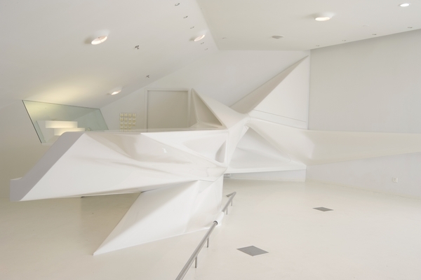 Das Ergebnis ist nicht nur ein schönes Objekt, sondern vor allem eine gelungene Verbindung von Raum, Form und Bewegung.Denn der Weg, den die Besucher durch den Pavillon nehmen, hat – gewissermaßen als Leitlinie für die Verformung der Schachtel – die Raumhülle geformt. Er führt zuerst über eine lange Rampe auf das Niveau von 1,5 Metern und von dort in einer S-Schleife wieder abwärts ins zentrale Auditorium. Hierkommt ein zweiter Aspekt des Entwurfs zumTragen: Ursprünglich hatten die Architekten ihr Projekt unter dem Titel „Topology of Sound“ zum Wettbewerb eingereicht und dieGeometrie des Hauptsaals als Verräumlichung von Schallwellen konzipiert. So folgenDecke und Boden des Raums, in dem sich bis zu 300 Menschen aufhalten können, einerleichten, wellenförmigen Bewegung. Hier werden die Besucher mit einem Mix aus Klassik, Pop und elektronischer Musik beschallt und mit Projektionen zu den Themen Berge, Wald, Wasser und Stadt süchtig nach den Schönheiten Österreichs gemacht.