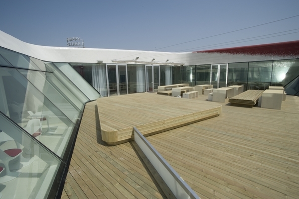 Nach Verlassen des Saals verzweigt sich der Weg, entweder ins Freie oder ins Obergeschoß, wo sich ein Restaurant mit Innenhof befindet, der sich zu einem begehrten Ruhepol in der Hektik der EXPO entwickeln wird. Auch im Restaurant folgt die Geometrie dem Prinzip kontinuierlicher Übergänge. Säulen gibt es nicht, und wo sie statisch notwendig wären, stützt sich einfach die Decke in einer eleganten Bewegung auf dem Boden ab.