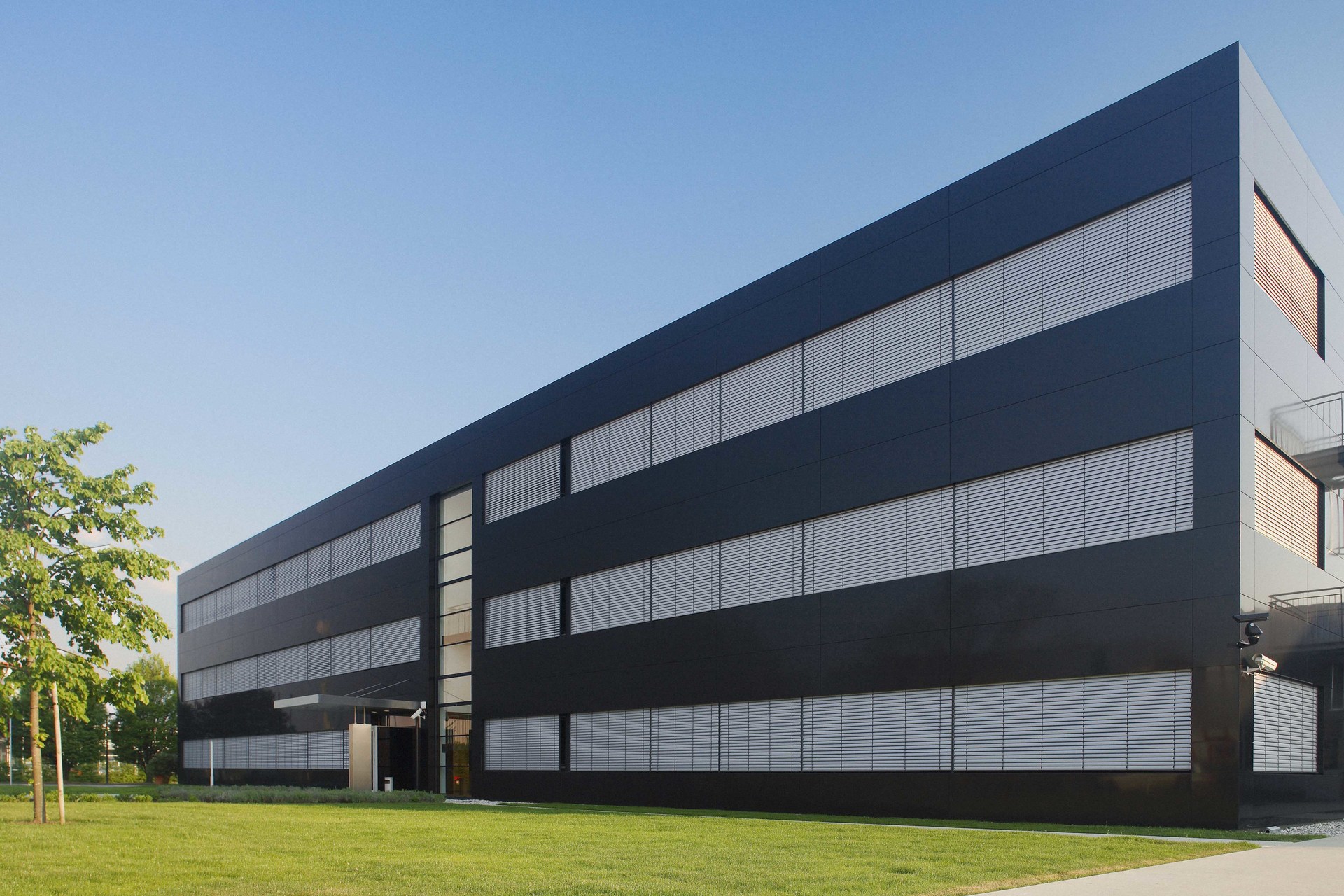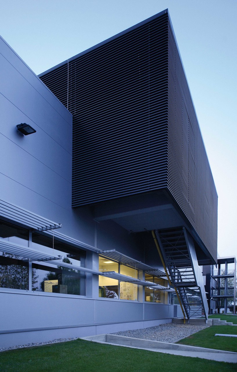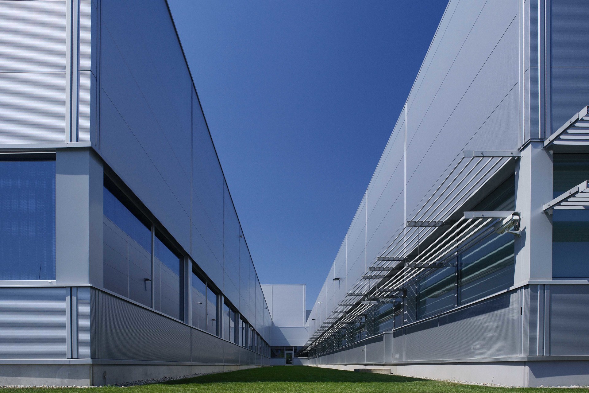 Die Fassaden dieser Baukörper wurden mit handelsüblichen, silbergrauen Alu-Sandwichpaneelen verkleidet. Sämtliche Oberflächenwässer werden gesammelt über ein Reinigungsbiotop in den Untergrund zurückgeführt.