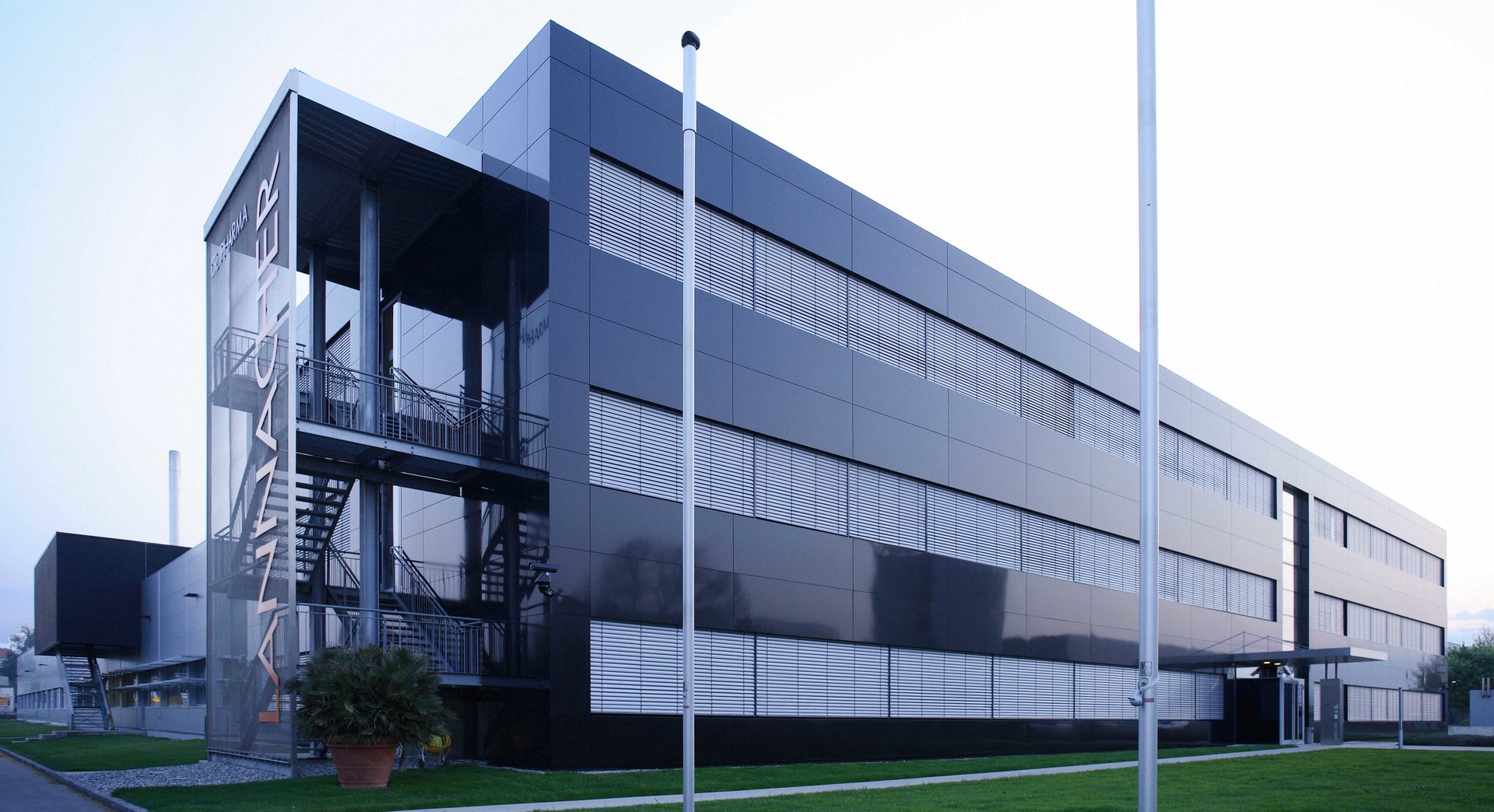 Büro- und Laborgebäude wurden in Stahlbetonbauweise mit Leichtbautrennwänden errichtet. Die Außenansicht dominiert schwarz-métallisé beschichtetes, großflächig verlegtes Alu-Cobond. Bei den hallenartigen Gebäuden - Produktion, Verpackung und Hochregallager - wurden die Stützen in Stahlbetonfertigteilen und die Dachtragwerke, je nach Konstruktions- und Funktionsökonomie, in Stahlfachwerken (Produktion, Konfektionierung) bzw. in Holzleimbindern (Hochregallager) ausgeführt.