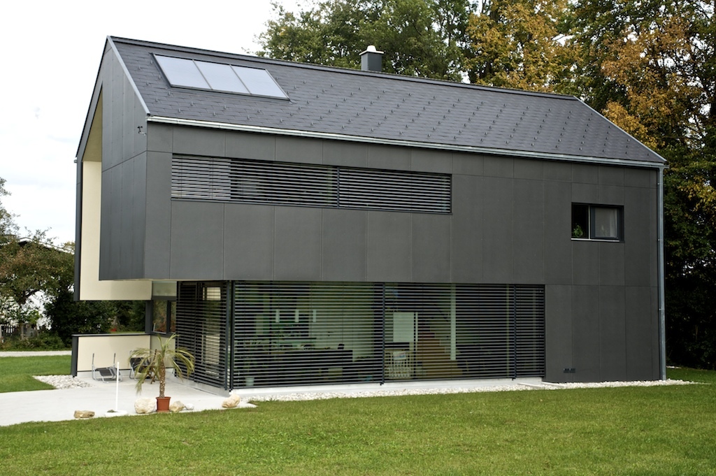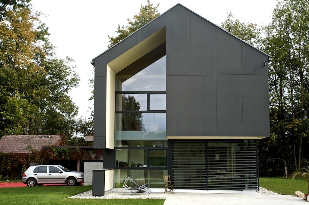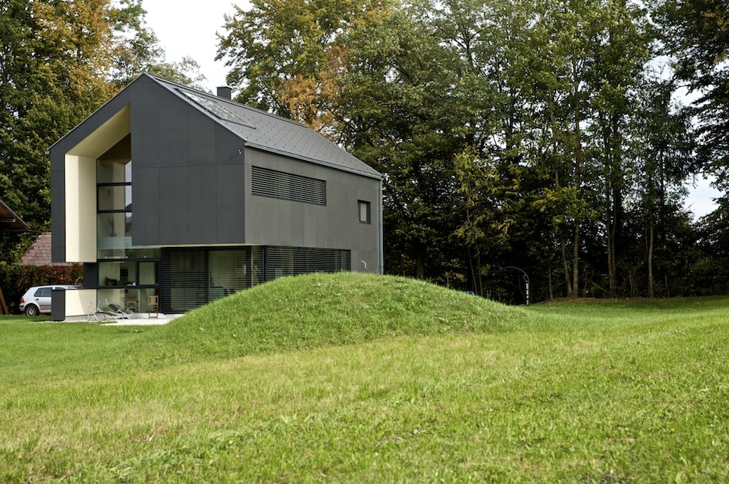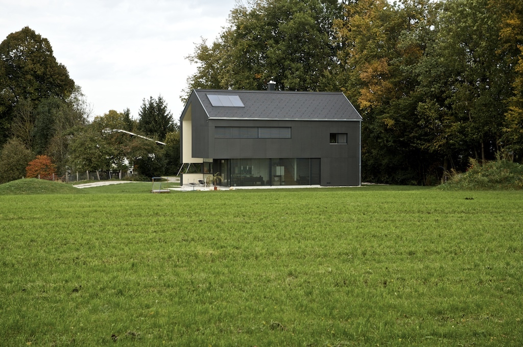 Abwechselnde Materialien von Putz und Zementfaserplatten lockern die Fassaden eines streng geometrischen Baukörpers in der sonst sensiblen Umgebung auf. Offene Räume bis unter das Dach ergeben spannende Blickbeziehungen. Ein zentraler Ofen versorgt das Haus zusätzlich mit Wärme, die sonst aus einer Erdwärme-Tiefenbohrung gewonnen wird.