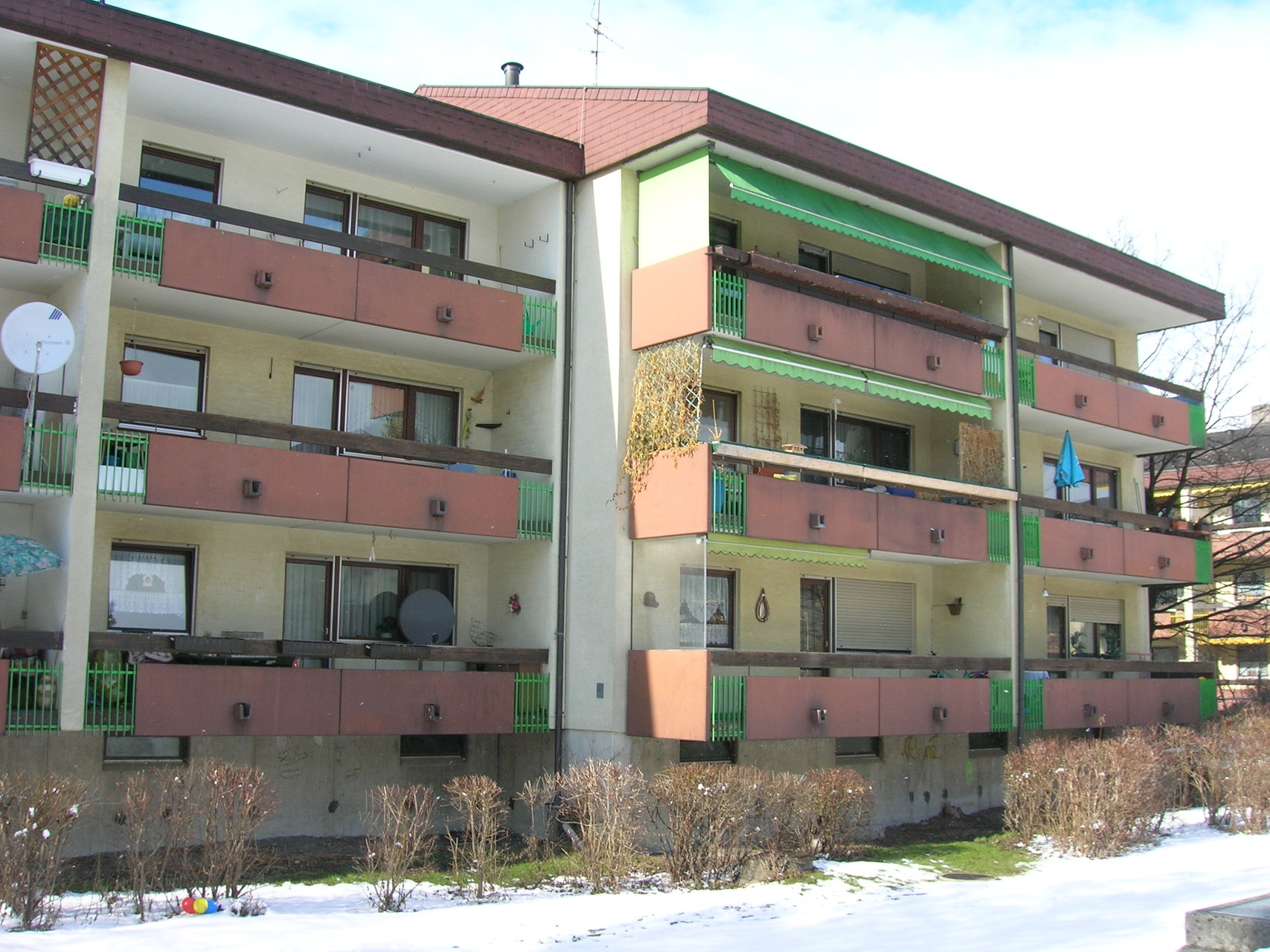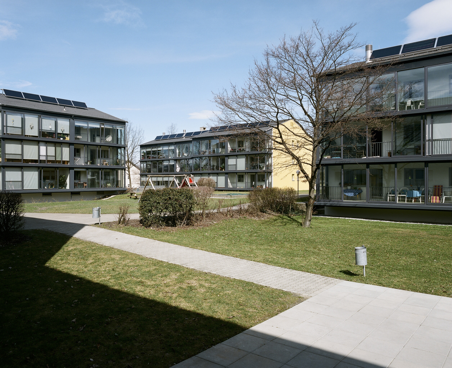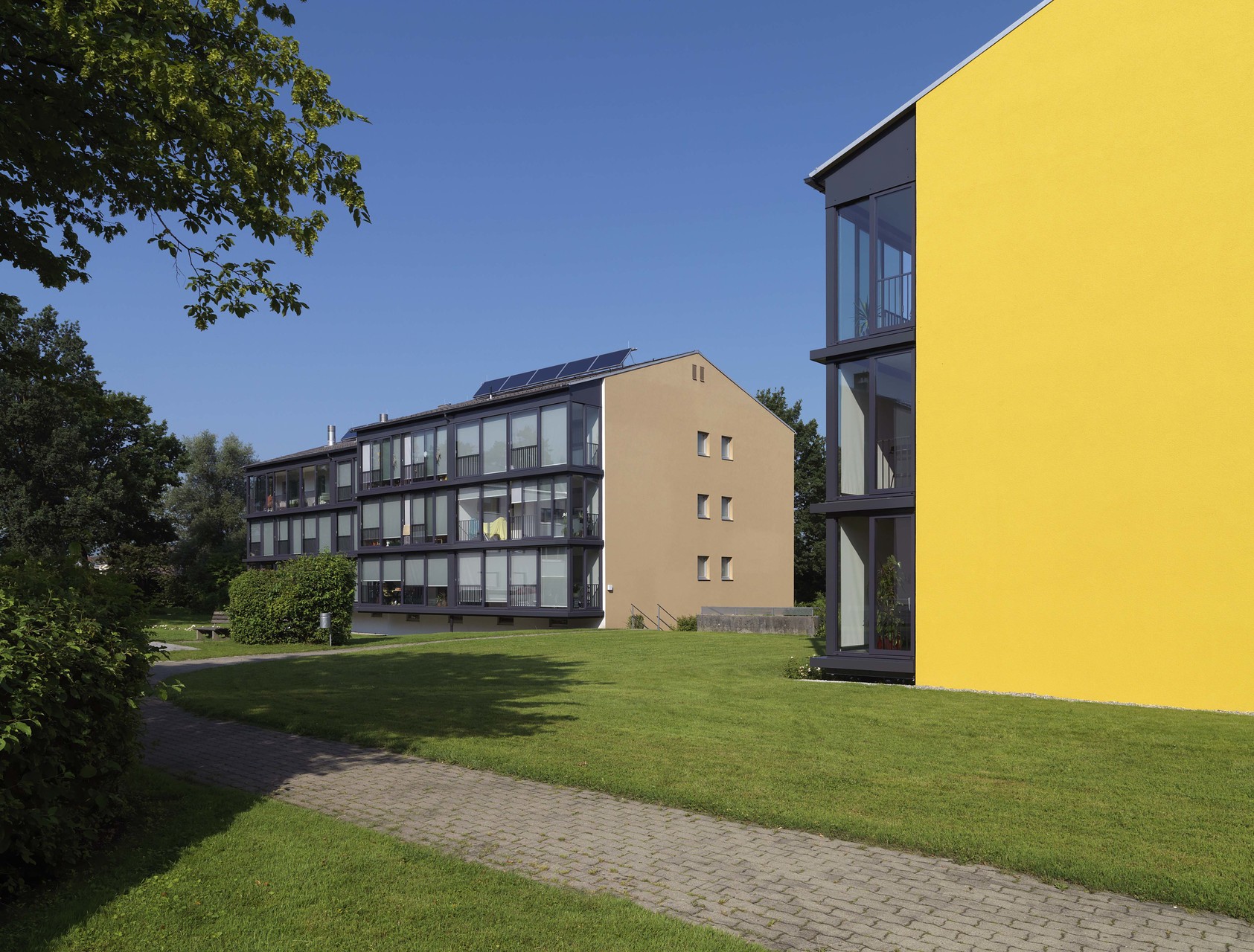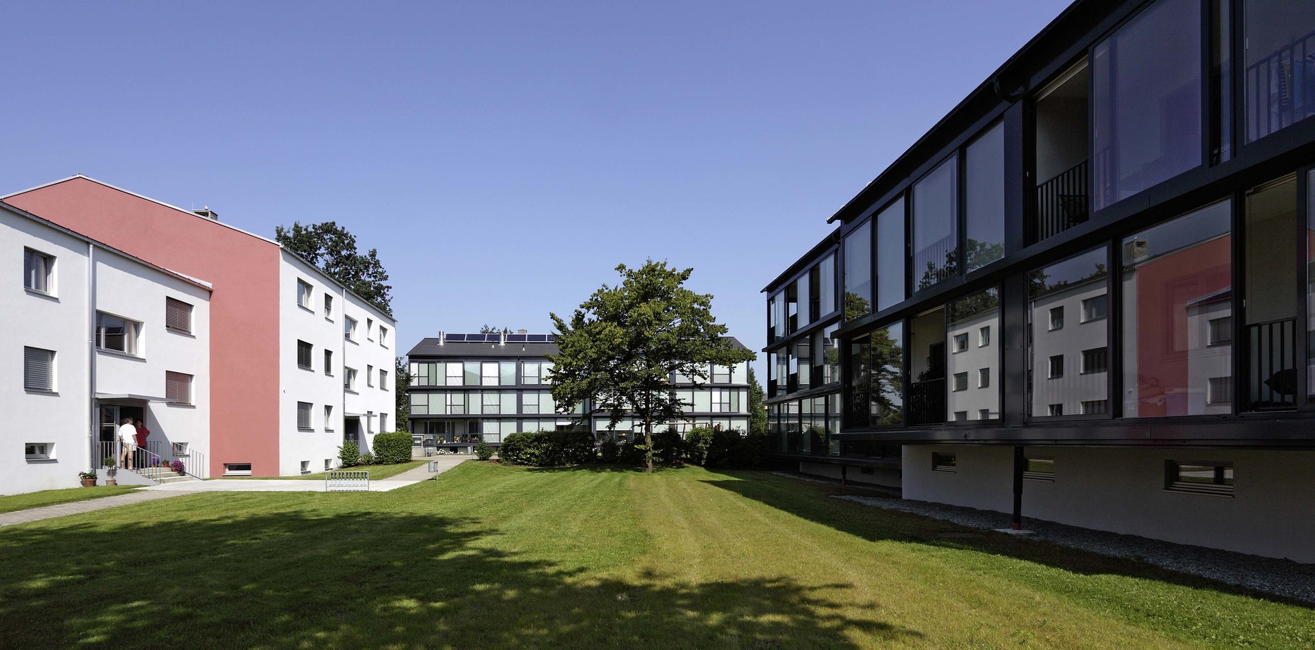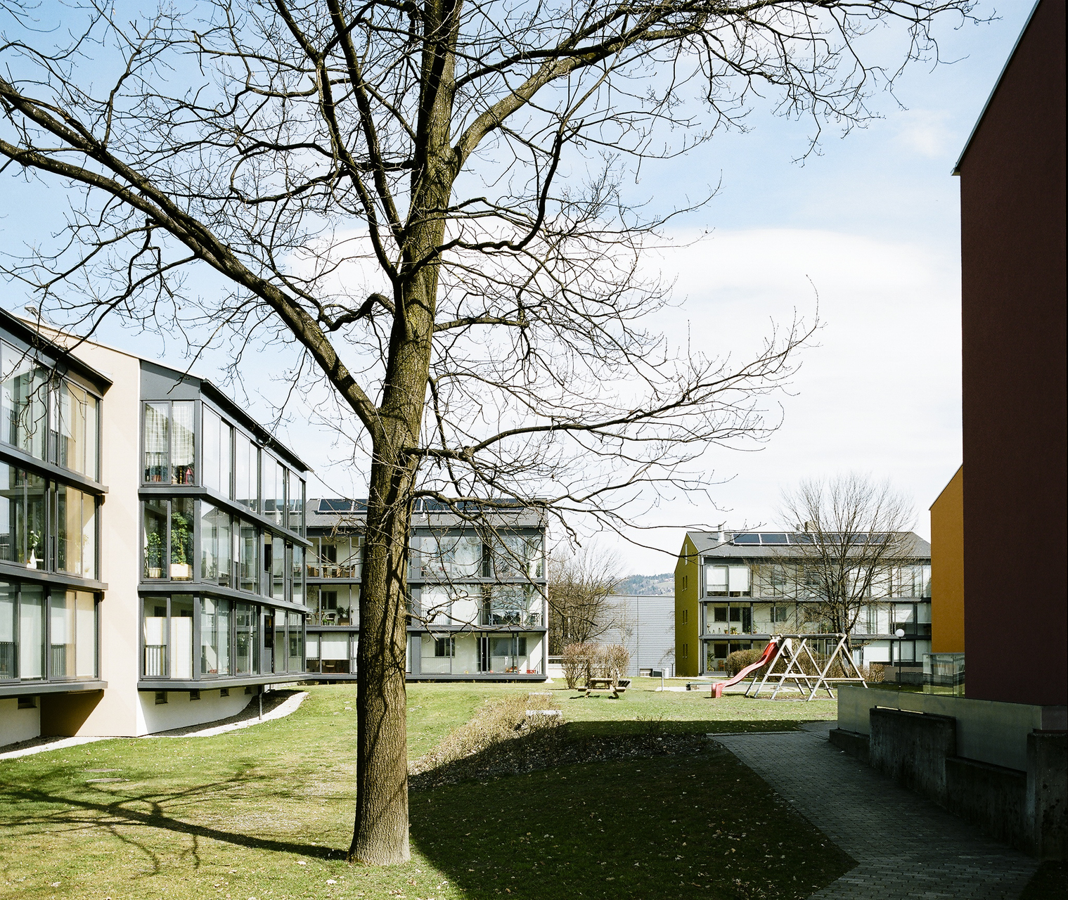 Aus dem Kältebrückenphänomen in Form der auskragenden Betonplatten wird ein thermischer Pufferraum als eine Art Wintergarten geschaffen, der zur Hälfte öffenbar und fast das ganze Jahr nutzbar ist. Insgesamt wirkt das Wohnumfeld aufgewertet: Freiräume, Wege, Stiegenhäuser und Aussenanlagen sind neu gestaltet. Materialien wie Glas und Aluminium und ein Farbkonzept geben der abgewohnten Anlage neben energetischen Verbesserungen auch ein frisches Gesamterscheinungsbild. (Text: Martina Pfeifer Steiner)