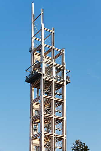 Das Ausstellungsgebäude mit Cafeteria wurde als schlichter, zweigeschoßiger Holzbau angelegt, dessen Erdgeschoß möglichst transparent, die Box im Obergeschoß hingegen in kräftigem Rot gehalten ist. Über eine verglaste Brücke in Stahlkonstruktion gelangt man zum Turm, der über einer Grundfläche von acht mal sieben Metern in Fichtenholz errichtet ist. Die Bodenhaftung für das Holzgerüst wird durch einen Sockel aus Stahl hergestellt, die Entkoppelung vom Boden für die Besucher erfolgt über zwei halbrund verglaste Panoramalifte, die ostseitig auf die auf 40 Meter Höhe gelegene Aussichtsplattform hochziehen. Während man hinaufschwebt, erschließt sich die Größe des Areals mit seinen Kränen, Baumaschinen, bereits ersichtlich konfigurierten Bauteilen, Gleiskörpern und Zügen und unzähligen Bauarbeitern. Der „Hochstand“ ist 66 Meter hoch und damit der höchste begehbare Holzturm Europas, eine auch statische Innovation.