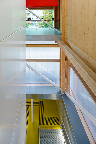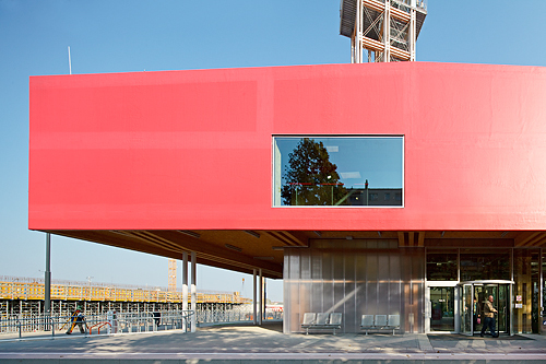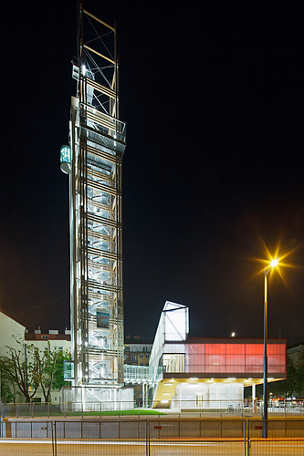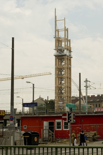 Nachdem ein Gemeindebau aus den Sechzigerjahren kurzerhand geschleift wurde – auch wegen der Verlegung der Sonnwendgasse, die durch die neue Gleisführung für die Bahnhofsanlage notwendig geworden war –, konnte auf dem vorhandenen Kellergeschoß neu aufgebaut werden. Es sollte ein Stück temporärer Architektur für die Dauer der Bauarbeiten werden, und RAHM architekten näherten sich diesem durchaus im Sinne des Konstruktivismus an: ein Objekt von signalhafter Wirkung, kostengünstig, schnell aufgestellt, aber auch demontierbar und nachhaltig in der Materialität, weil aus Holz und somit wiederverwertbar. Der Turm wird zur Tribüne, das Baugelände zur Bühne erklärt, von der aus das Schauspiel Baustelle verfolgt werden kann.