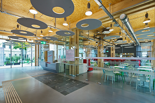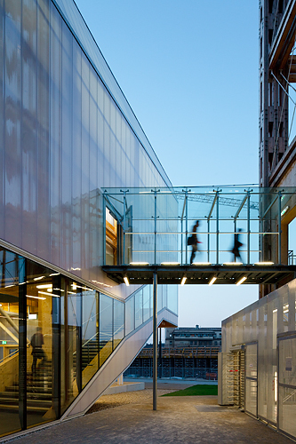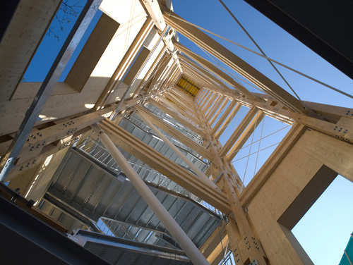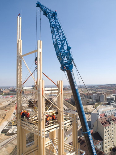 Experimentelle Holzbauten wurden in den Zwanzigerjahren von russischen Künstlern als „Set-Design“ auf die Bühne gebracht. Technoide Gebilde, auf mehreren Ebenen mit Rampen und Treppen verbunden, dienten als sogenannte „Werkbank“ für die Schauspieler. Die Bühnenaufbauten thematisierten die Ästhetisierung der Konstruktion an sich und legten den Grundstein – oder besser den Bundtram – für den Konstruktivismus in der Architektur. Die Bauten aus Holz fanden bald ihren Weg in den Außenraum, wie Konstantin Melnikows sowjetischer Pavillon für die Weltausstellung in Paris 1925: Ein über den Ausstellungsräumen markant aufragender Turm in Holzkonstruktion als reiner Werbeträger mit dem „Logo“ USSR machte die Architektur zum Symbol der aufstrebenden Sowjetunion. Als die Türme begehbar gemacht wurden, geriet die Umgebung selbst zum Set, konnte diese doch plötzlich von oben herab ergründet werden. Genau diese Programmatik bietet nun in Wien die Möglichkeit, eine spannende Work in progress zu verfolgen: die Errichtung des Hauptbahnhofes mit umgebender Büro- und Wohnbebauung.