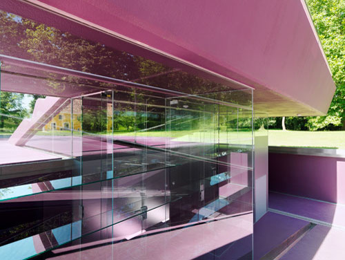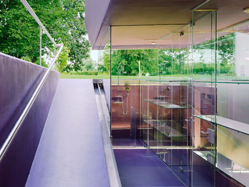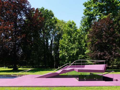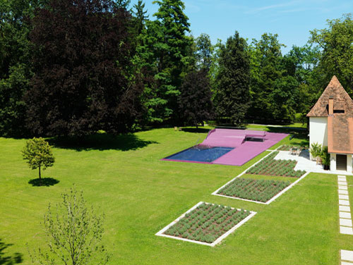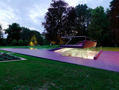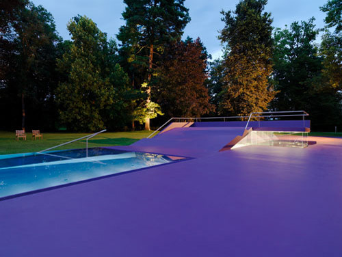 Becken, Beckeneinstieg, Liegeterrasse, Spielplatz, Sitzrampe sowie Sonnendeck werden als Zonen einer einzigen Figur aufgefasst, die mit Polyester bzw. Polyurethan völlig homogen beschichtet im Rasen des Parks liegt. Wo sich diese Figur als Sitzrampe aus dem Rasen in die Höhe klappt, wird unter Niveau Platz für Umkleiden und Nebenräume freigegeben, die als Nurglaskonstruktion unter der frei tragenden Betonkonstruktion angeordnet sind. Beckeneinstieg und Sitzrampe sind an deren Oberfläche wellenförmig verformt, sodass anatomisch geformte Sitz- und Liegemulden entstehen. (Text: Architekten)