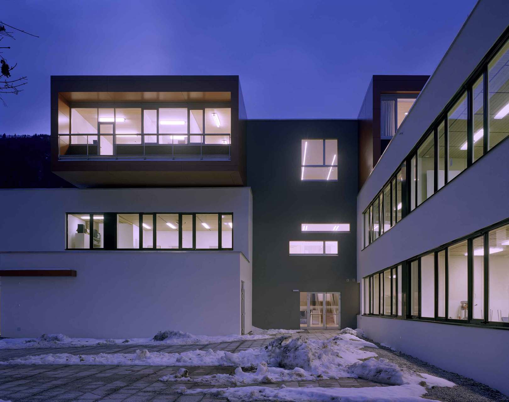 Das bestehende Gebäude ist durch ein zentrales Stiegenhaus erschlossen. Eine neue Stiege – in Konstruktion und Materialität als neues Element zu erkennen – führt ins Dachgeschoß und schafft somit die Verbindung von Alt und Neu. Dem Bestand aufgesetzt sind lichtdurchflutete Baukörper, die durch den Einsatz von Aluminium und Glas spektakuläre Sichtbezüge zur umliegenden Landschaft ermöglichen. Beim gesamten Gebäudekomplex wurde die Fassade wärmegedämmt. Das Ergebnis: Ein wesentlicher Beitrag zum Energiesparen wurde geleistet.