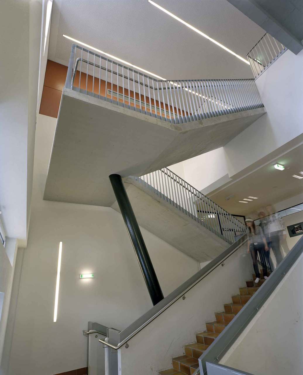 Die Fassaden der bestehenden Gebäudetrakte der Schule wurden als klassische weiße Baukörper mit schwarzen Fensterbändern gestaltet. Die neuen Bauteile differenzieren sich durch eine Aluminiumfassade sowie durch Fassadenelemente aus Aluminium.