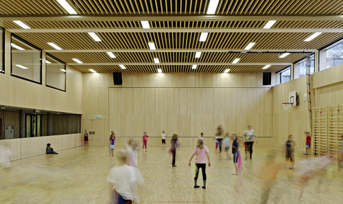 Die Kinderkrippe ist über das zentrale Stiegenhaus, sowohl mit dem bestehenden Kindergarten, als auch mit dem Mehrzwecksaal / Sporthalle verbunden. Den Gruppenräumen sind beiderseits überdachte Balkone vorgelagert. Im Erdgeschoss wurde ein Freibereich geschaffen, der für beide Gruppen nutzbar ist. Die Grünfläche bietet einen geschützten Spielbereich, in dem sich die Kinder frei bewegen können. (Text: Architekt)