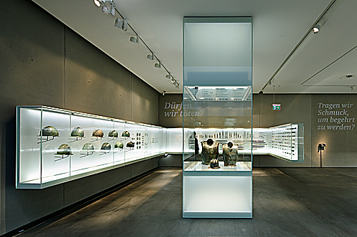 Bewusst zurückhaltend der Einsatz von Materialien und Farbe: Das Grau von Sichtbetonwänden und Estrich der als rohe Betonhülle konzipierten Halle mit einer Fläche von 651 m² bildet den ruhig-dezenten Hintergrund für die ca. 1.250 durchwegs kleinformatigen Exponate. Diese werden gleichsam im Raum schwebend in hochtransparenten, frei im Raum verteilten Nurglasvitrinen mit hinterleuchteten Glasböden präsentiert, die den Raum zusätzlich rhythmisch gliedern. Die Highlights der Sammlung – etwa der Strettweger Wagen – werden in raumhohen Vitrinensäulen hervorgehoben, deren Positionierung in den vier Hauptachsenpunkten des Neubaus auch die Wegführung markiert.