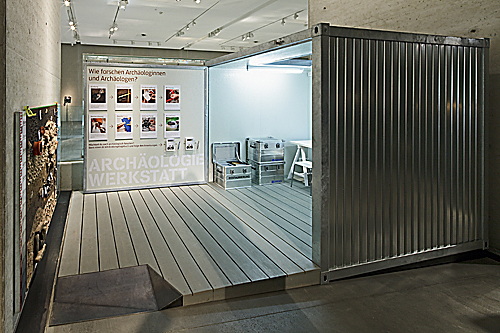 Die unterirdische, zweischiffige Ausstellungshalle mit mittig durchlaufender Oberlicht-Laterne gliedert sich in drei Bereiche mit unterschiedlichen Bodenniveaus: Über eine leicht ansteigende Rampe – als Verweis auf die Architektur des Lapidariums – werden die Besucher entlang der Exponate in den hinteren Bereich der Schau navigiert, der eben zurückführt und als Teil des Ausstellungsrundgangs Neubau, Lapidarium und Planetengarten verbindet. Der Mittelteil der Halle – durch Betonwände als offen-separierte Einheiten strukturiert – präsentiert sich als vom Tageslicht durchflutete Raumfolge. Hier finden sich eine Recherche- und Ruhezone für die Besucher, ein eigens für Kinder entwickelter „Grabungscontainer“ sowie ein „Labortisch“ mit kleinem Wechselausstellungsbereich