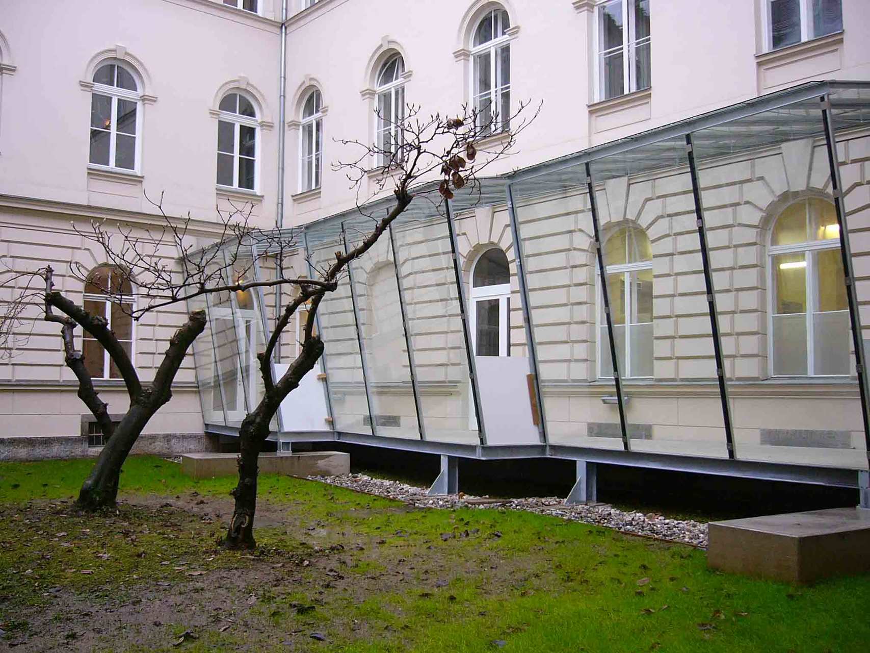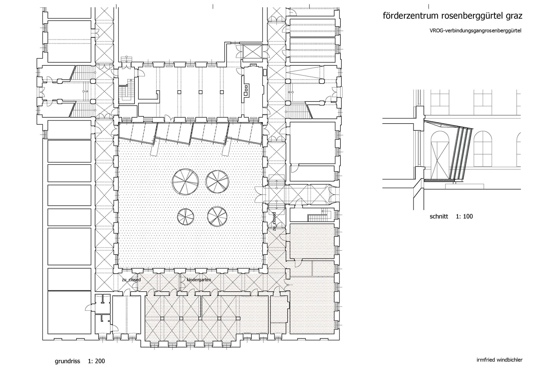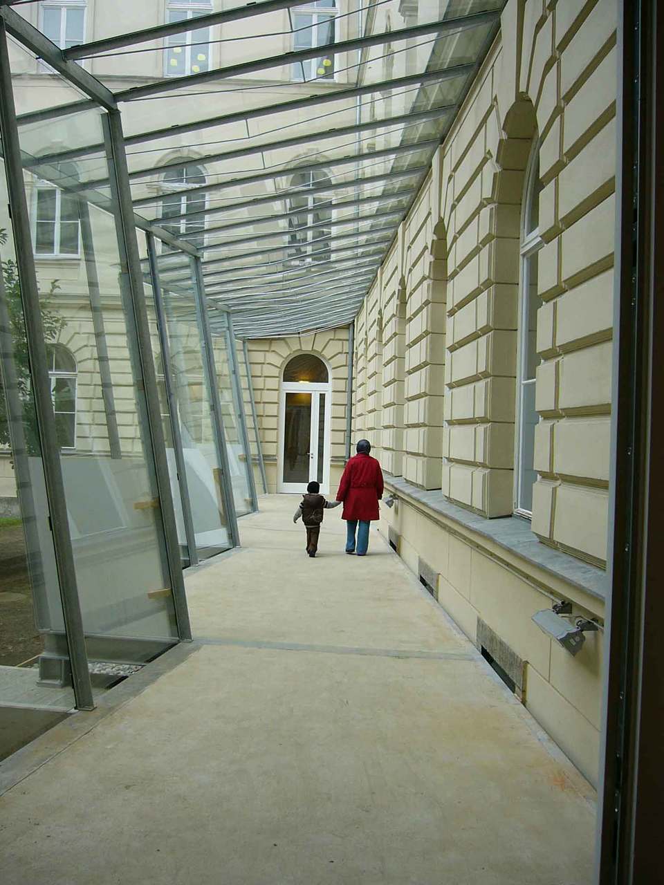 Von einem Kindergartenprojekt im Förderzentrum des Landes Steiermark, einem Schulgebäude aus der Gründerzeit, blieb lediglich ein Verbindungsgang in einem der Innenhöfe übrig.Dieser dient als kurze Verbindung zwischen den Eingangs- und Garderobenbereichen und ermöglicht auch den Zugang in den Innenhof. Der Gang wurde als verzinkte Stahlskelettkonstruktion ausgeführt und verglast. Dadurch wirkt er leicht und transparent, trotzdem halten die Oberflächen auch eine rauere Behandlung durch die Schüler aus. Durch die verzahnt geführten geneigten Aussenwände hat der Gang je nach Gehrichtung sehr unterschiedliche Raumwirkungen, in der einen Richtung geschlossen, in der anderen offen. (Text: Architekt)