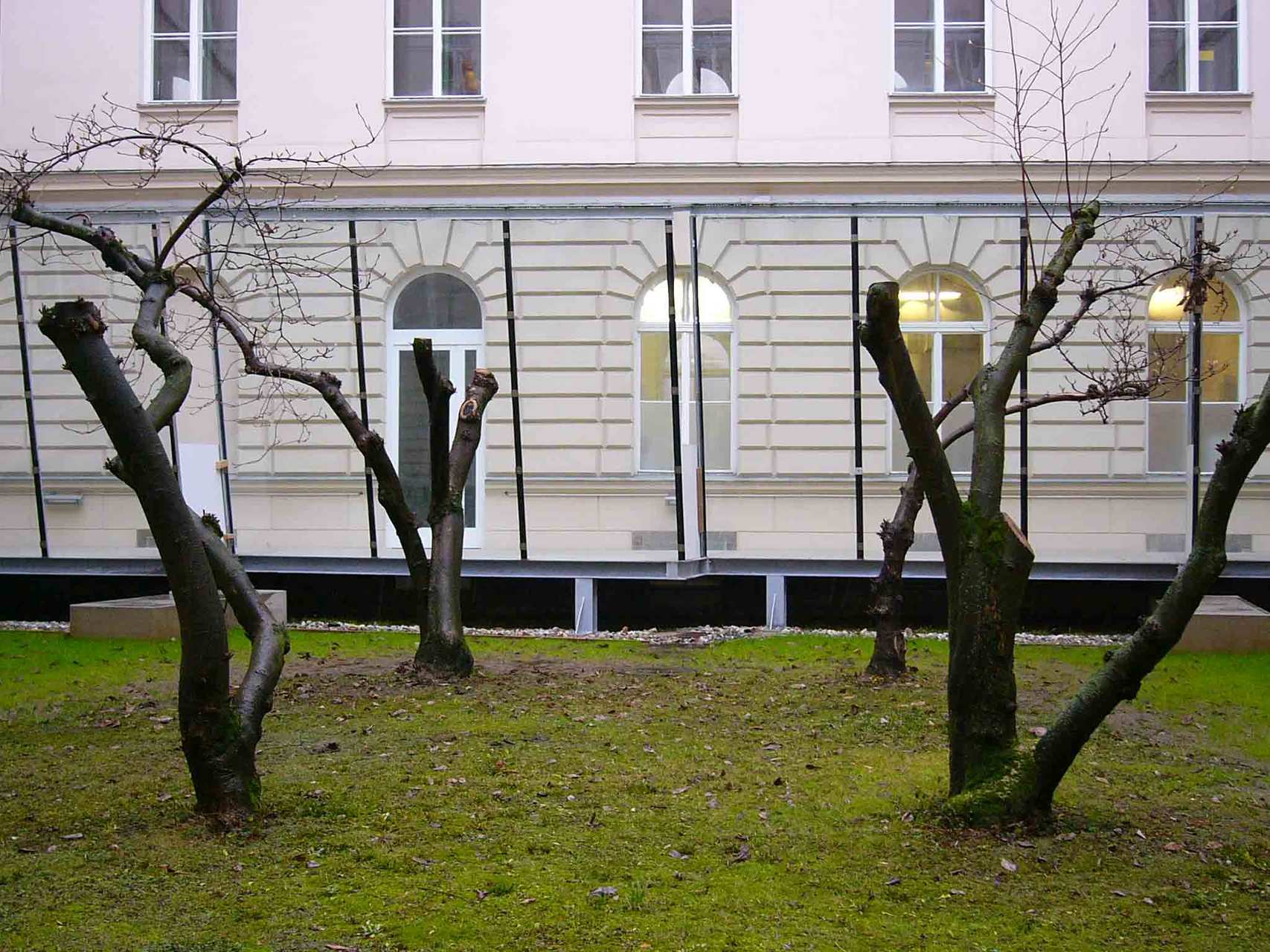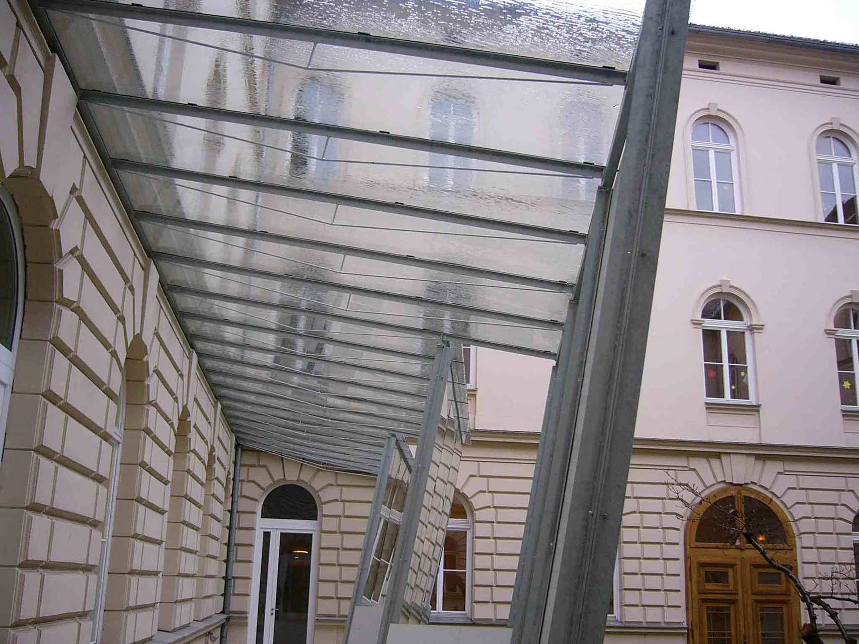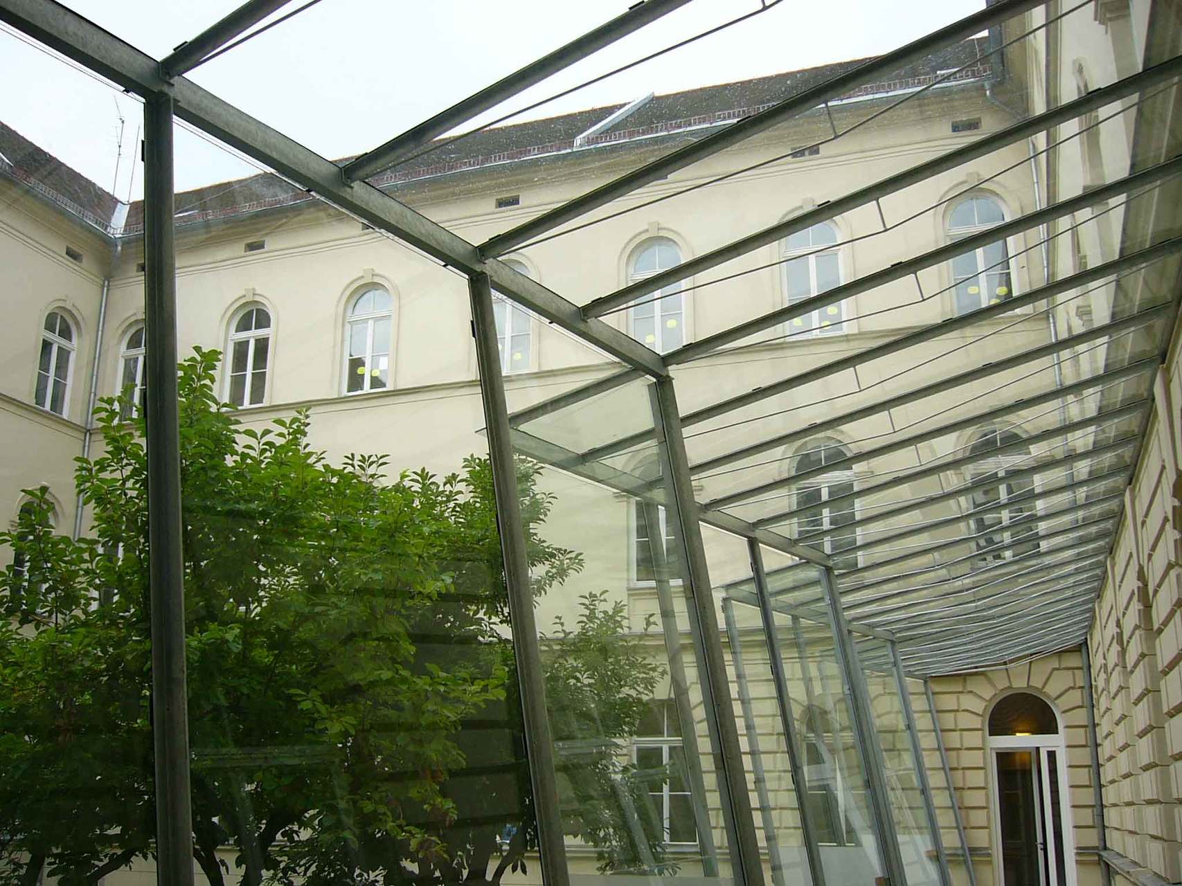 Von einem Kindergartenprojekt im Förderzentrum des Landes Steiermark, einem Schulgebäude aus der Gründerzeit, blieb lediglich ein Verbindungsgang in einem der Innenhöfe übrig.Dieser dient als kurze Verbindung zwischen den Eingangs- und Garderobenbereichen und ermöglicht auch den Zugang in den Innenhof. Der Gang wurde als verzinkte Stahlskelettkonstruktion ausgeführt und verglast. Dadurch wirkt er leicht und transparent, trotzdem halten die Oberflächen auch eine rauere Behandlung durch die Schüler aus. Durch die verzahnt geführten geneigten Aussenwände hat der Gang je nach Gehrichtung sehr unterschiedliche Raumwirkungen, in der einen Richtung geschlossen, in der anderen offen. (Text: Architekt)