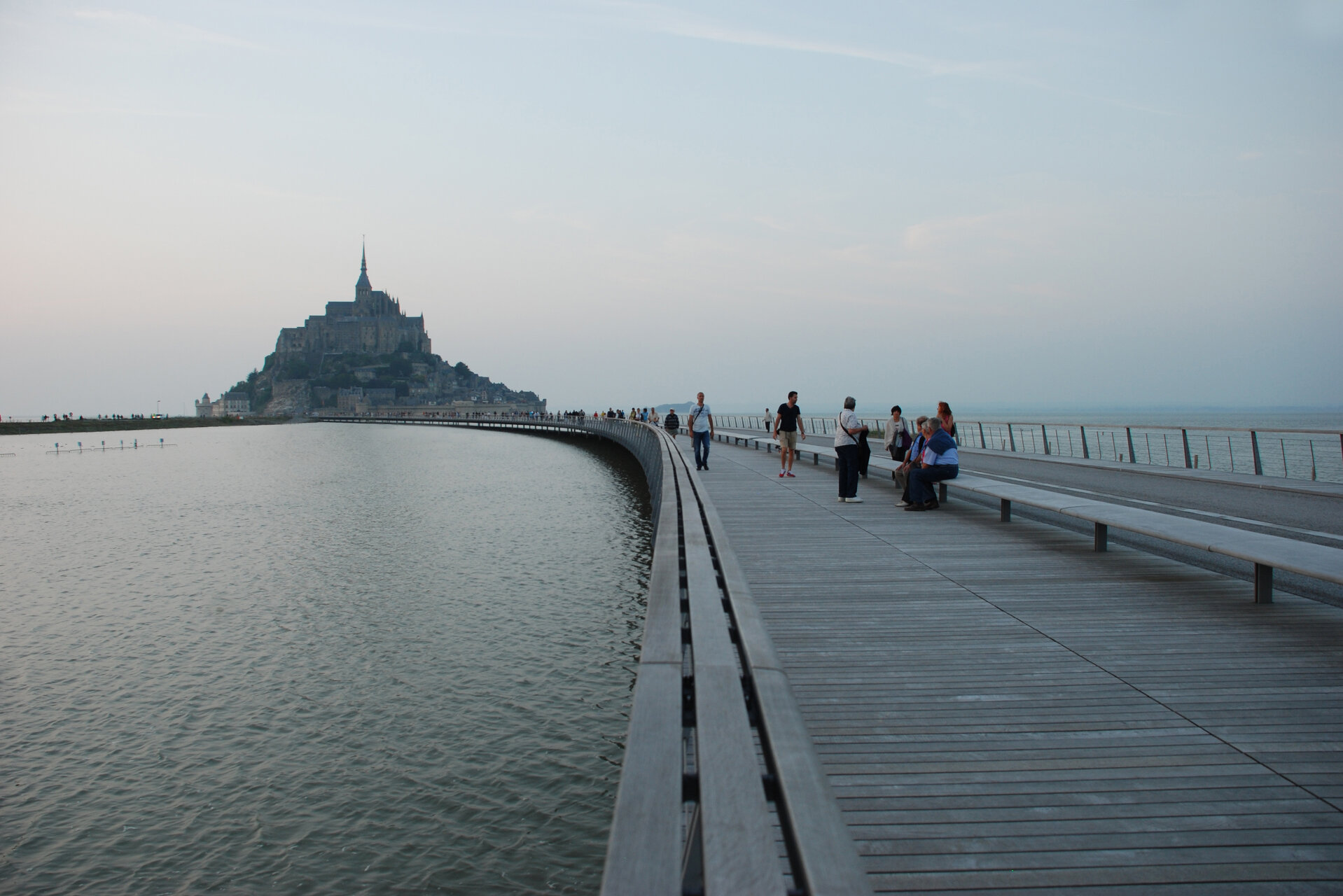 Der Querschnitt der Brücke ist asymmetrisch. Auf der einen Seite gibt es einen schmalen, 1,50 Meter breiten Fußweg für Alleinmarschierende und vielleicht auch für verliebt dahinschlendernde Pärchen, so Feichtinger. Auf der anderen Seite hingegen, mit Blick auf den offenen Atlantik, stehen 4,50 Meter Breite zur Verfügung, um jene sommerlichen Horden aufzunehmen, die den Weg per pedes dem motorischen Dahingeshuttle vorziehen. Und davon wird es eine Menge geben. Mit rund 2,5 Millionen Besuchern pro Jahr gilt die Abtei nach Paris als beliebtestes Touristenziel Frankreichs.