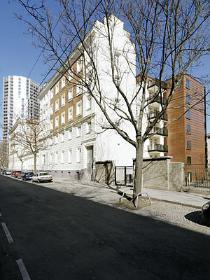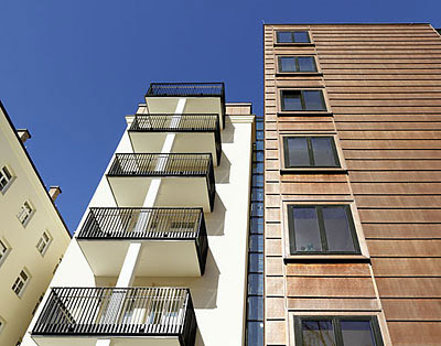 Sonja Gasparin und Beny Meier haben den Bestand, dessen Fassade an der Meldemannstraße unter Denkmalschutz steht, mit einem Zubau zu einer Funktionseinheit gekoppelt. Indem sie den neuen, siebengeschoßigen Bauteil in einem Respektabstand von einem Meter parallel zum Altbau entlang der Gartenseite anordneten, thematisieren sie die Dualität von Alt und Neu. Mit seiner mittlerweile Patina ansetzenden Kupferverkleidung an den Schmalseiten, dendunklen Stabgeländern der Loggien und Kompaktplatten in Holzoptik an der dem Park zugewandten Längsseite hebt sich der neue Trakt materiell von der weißen Putzfassade des Altbaus ab. Über Eck von der Meldemannstraße aus betrachtet, bemerkt aber, wie fein die Brauntöne mit der partiell in bräunlichem Backstein ausgeführten Straßenansicht des Bestandes harmonieren. Auch die Baukörperkonfiguration nimmt miteinem Mittelrisaliten Bezug auf die strenge Axialität des Bestandes, sodass der neue Annex bei aller formalen, zeitgemäßen Eigenständigkeit dem Alten durchaus eine gewisse Achtung entgegenbringt.