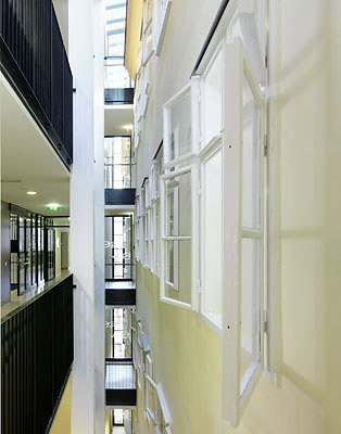 Pro Geschoß überbrücken zwei Stege die Schlucht zwischen den Häusern. Die inneren Scheiben der Kastenfenster wurden aus Brandschutzgründen mit Fixverglasungen versehen. Sie sind aus Mattglas, um den Einblick in die dahinterliegenden Bäder undEingangsbereiche von Zimmern zu verhindern. Die äußeren Flügel wurden saniert undblieben erhalten. So entstand eine Situation,die den oft nicht mehr mobilen Bewohnern eine städtische Hausfassade in das Innere des gemeinsamen, halbprivaten Wohn- und Aufenthaltsbereiches holt, die in ihrer schlichten Schönheit Erinnerungen an das frühere Leben „draußen“ zu wecken imstande ist. Kommunikation nach außen und über Geschoße hinweg ermöglichen auch die beiden Fassadeneinschnitte im Mittelrisaliten an der Gartenfassade, wo durch das Aussparen von jeweils zwei Zimmern übereinander geräumige Loggien entstanden sind.