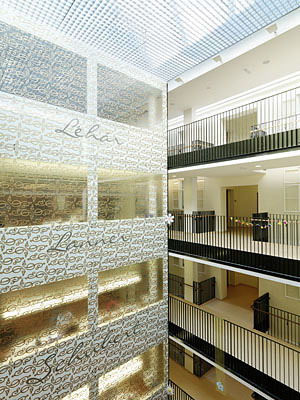 Das Gemeinschaftsleben spielt sich im Wesentlichen im Herz des Gebäudes ab. Hier bringt ein Atrium Licht von oben in die Tiefe und ermöglicht geschoßübergreifende Kontaktaufnahme. Hier liegt der Erschließungskern, hier befinden sich an strategisch günstiger, weil guten Überblick bietender Stelle die Stationsstützpunkte sowie Aufenthaltsbereiche, in denen zum Beispiel gemeinsam gegessen wird. Dieser Bereich grenzt an die Naht zwischen den beiden Bauteilen, wo der Dialog zwischen Alt und Neu im Inneren besonders spürbar ist. Denn hier lässt es sich im Neubau entlang der dreiseitig verglasten „Trennfuge“ am Altbau vorbeipromenieren, dessen Fassade in ihrer ursprünglichen Form erhalten blieb und nun zugleich Gebäudeabschluss des einstigen Männerwohnheims und Innenraumbegrenzung des neuen Teils ist.