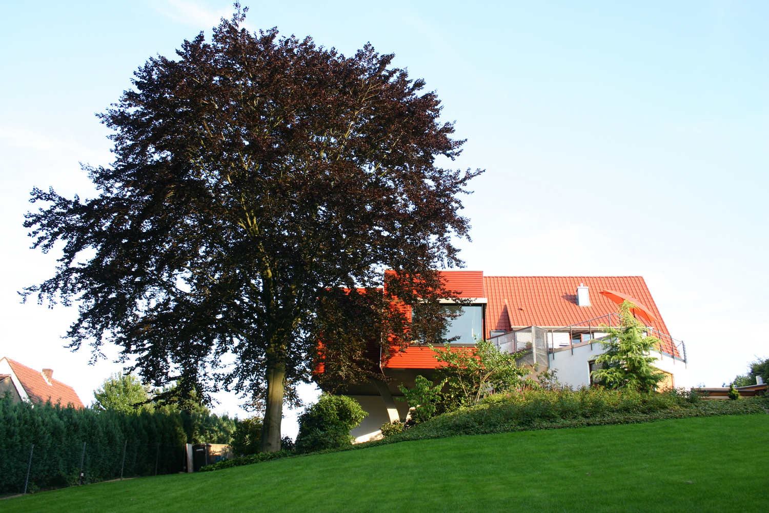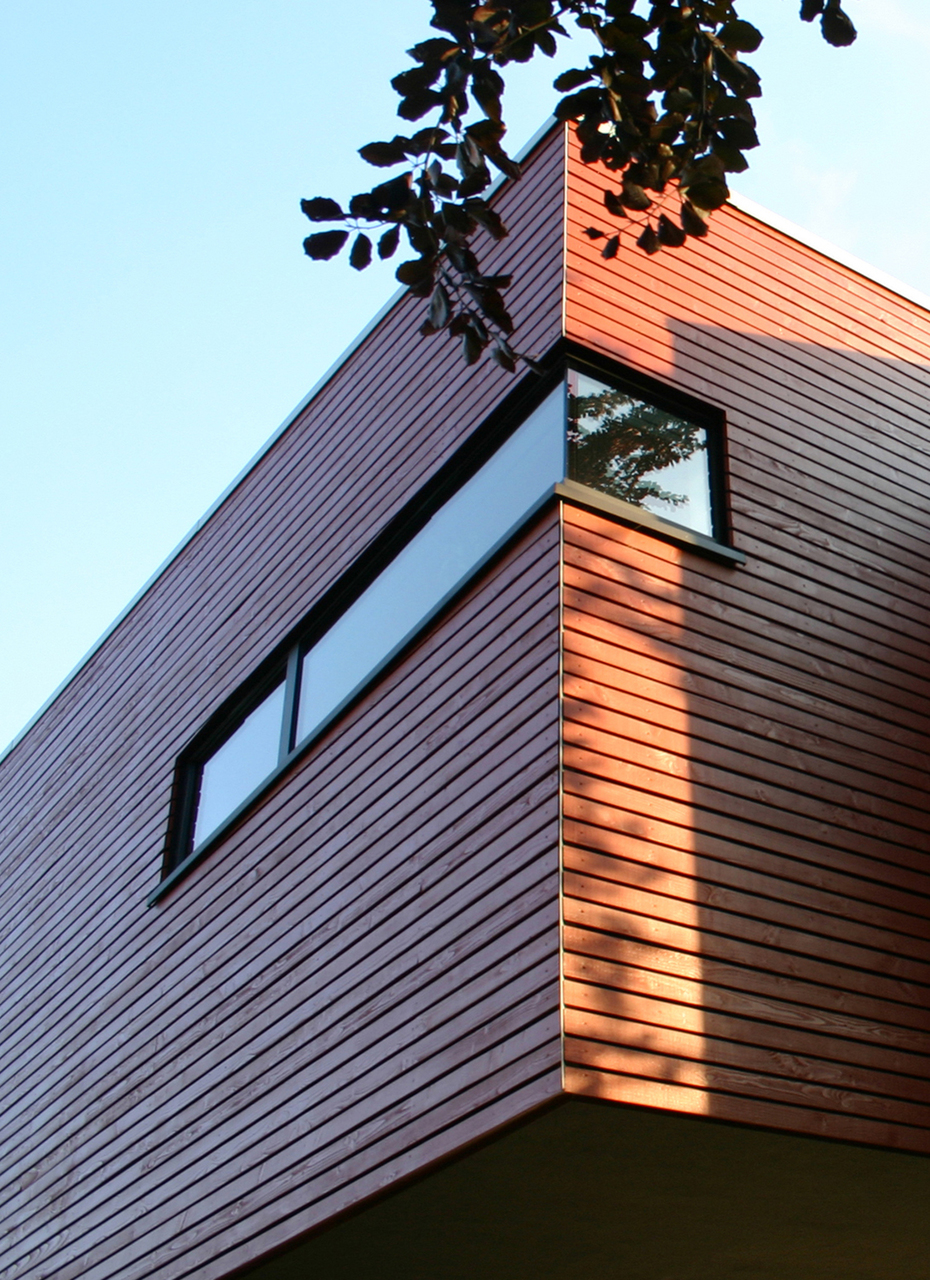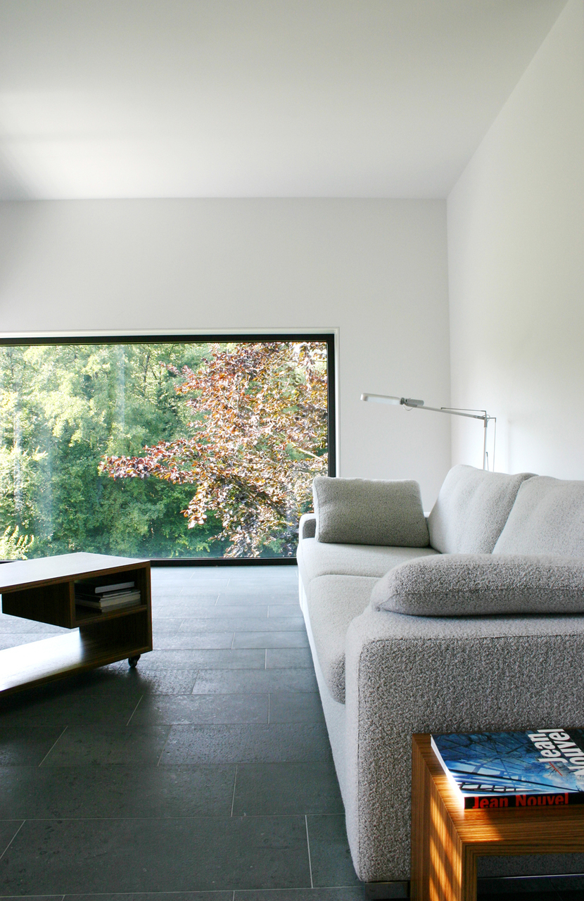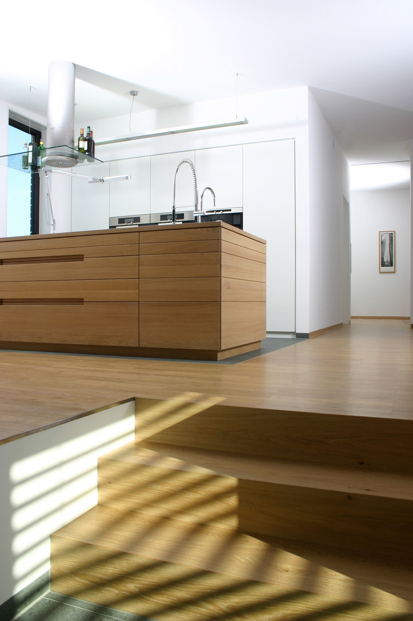Gemeinsam mit dem Bauherren wird eine offene Wohnform als Aufstockung auf dem Flachdach des Bürotraktes entwickelt, die Wahl der Konstruktion und der Materialien ist in Bezug zum Familienbetrieb schnell gefallen – eine Holzrahmenkonstruktion kommt zum Einsatz. In Anlehnung an die Geländestruktur folgt die Erweiterung der Hanglage, der Kubus neigt sich zum Garten und macht den Blick frei ins Grüne. Der Wohnbereich zieht sich zurück durch sein abgesenkten Boden – das Kochen wird so zu dem zentralen Ereignis. Lediglich der Schlaf- und Ankleidebereich wird durch zwei Sanitäreinheiten separiert.
