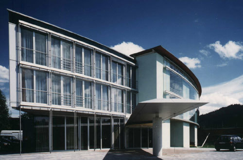 Die konvexe rund 130 m lange dreigeschoßige Südfassade verleiht dem Gebäude ein kompaktes Äußeres. Durch diese Krümmung werden nicht nur die internen Wege verkürzt, sondern es ist die Großform nie zur Gänze überschaubar. Die beträchtliche Dimension des Gebäudes wird so geschickt verborgen. Hinter der äußeren Schicht aus mobilen Glaselementen befinden sich witterungsgeschützte, jeweils zwei Zimmern zugeordete Loggien, die durch massive Wandflächen voneinander getrennt sind. Dieser Aufbau ist unmittelbarer Ausdruck des Energiekonzepts, das den passiven Wärmeeintrag nutzt und in den massiven Teilen, sie enthalten übrigens die Nasszellen, speichert. Das Gebäude erhielt für dieses innovative Konzept bereits 1998 den Österreichischen Solarpreis. (Text: Roman Höllbacher)