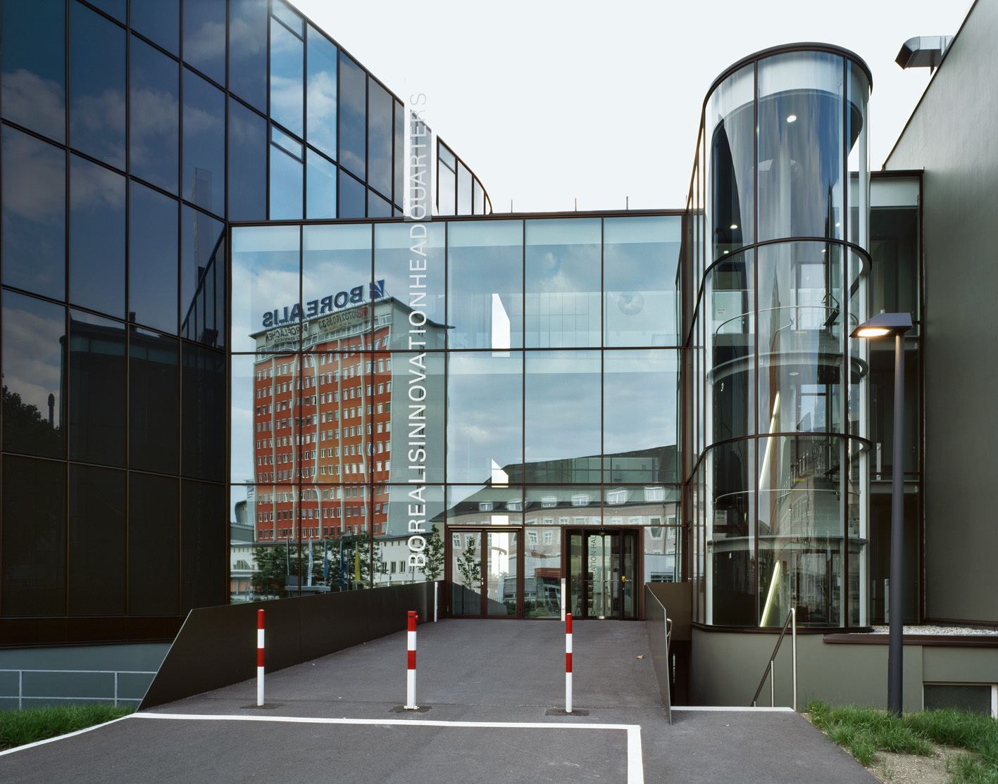 Innovation ist auch das eigentliche Thema in dem Gebäude, das die Architekten Dieter Henke und Marta Schreieck in Linz für das Chemieunternehmen Borealis entworfen haben. Hier entwickeln rund 350 Mitarbeiter neue Produkte und Verfahren für die Kunststoffe, die etwa in der Automobilindustrie oder für Verpackungsmaterialien eingesetzt werden. Der Konzern beschäftigt rund 5200 Mitarbeiter, 1600 davon in Österreich und die überwiegende Zahl in acht weiteren Ländern mit Produktionsstandorten von Finnland über Abu Dhabi bis in die USA. Entsprechend international sind auch die Forschungsgruppen, die im neuen Gebäude in Linz zusammenarbeiten.