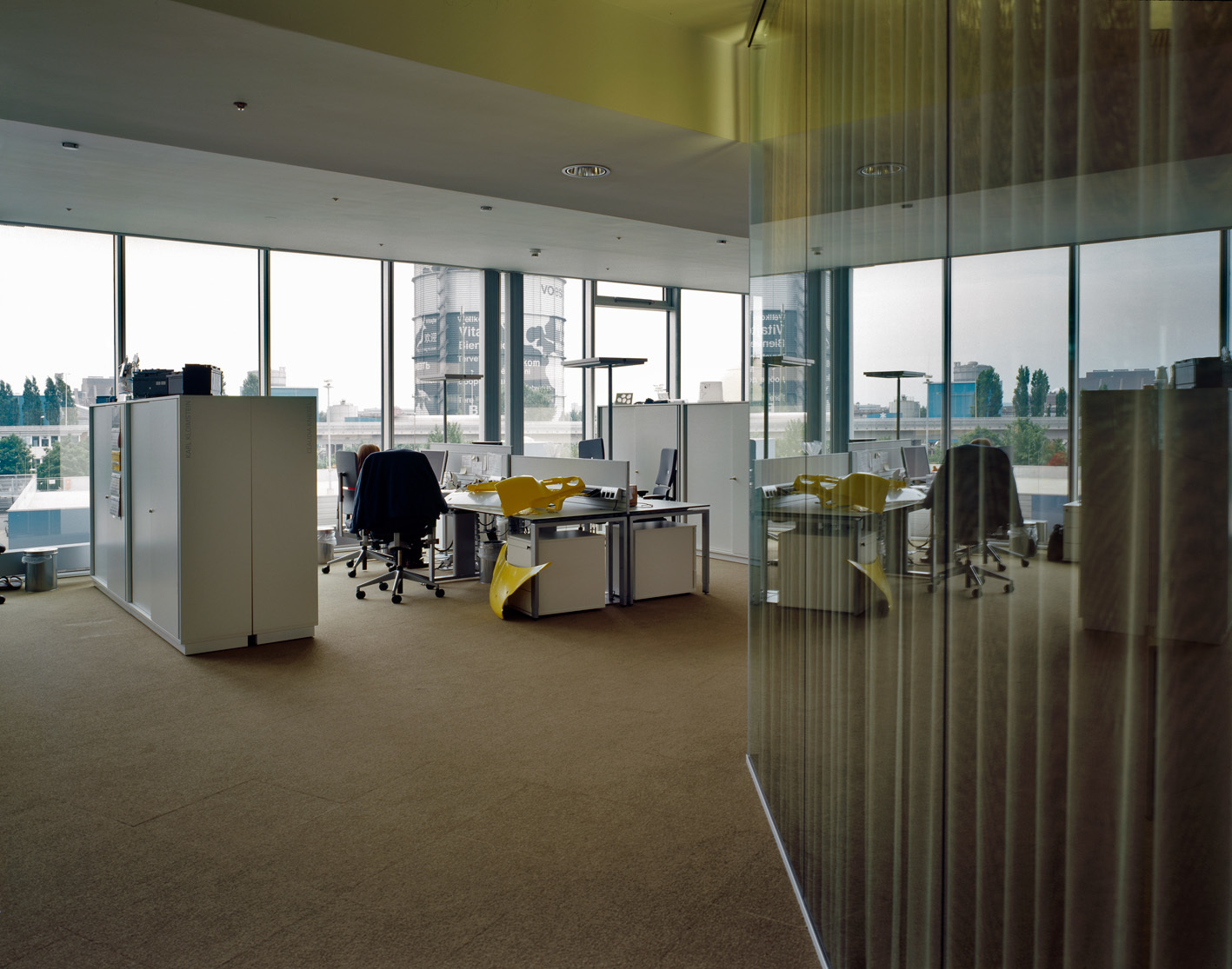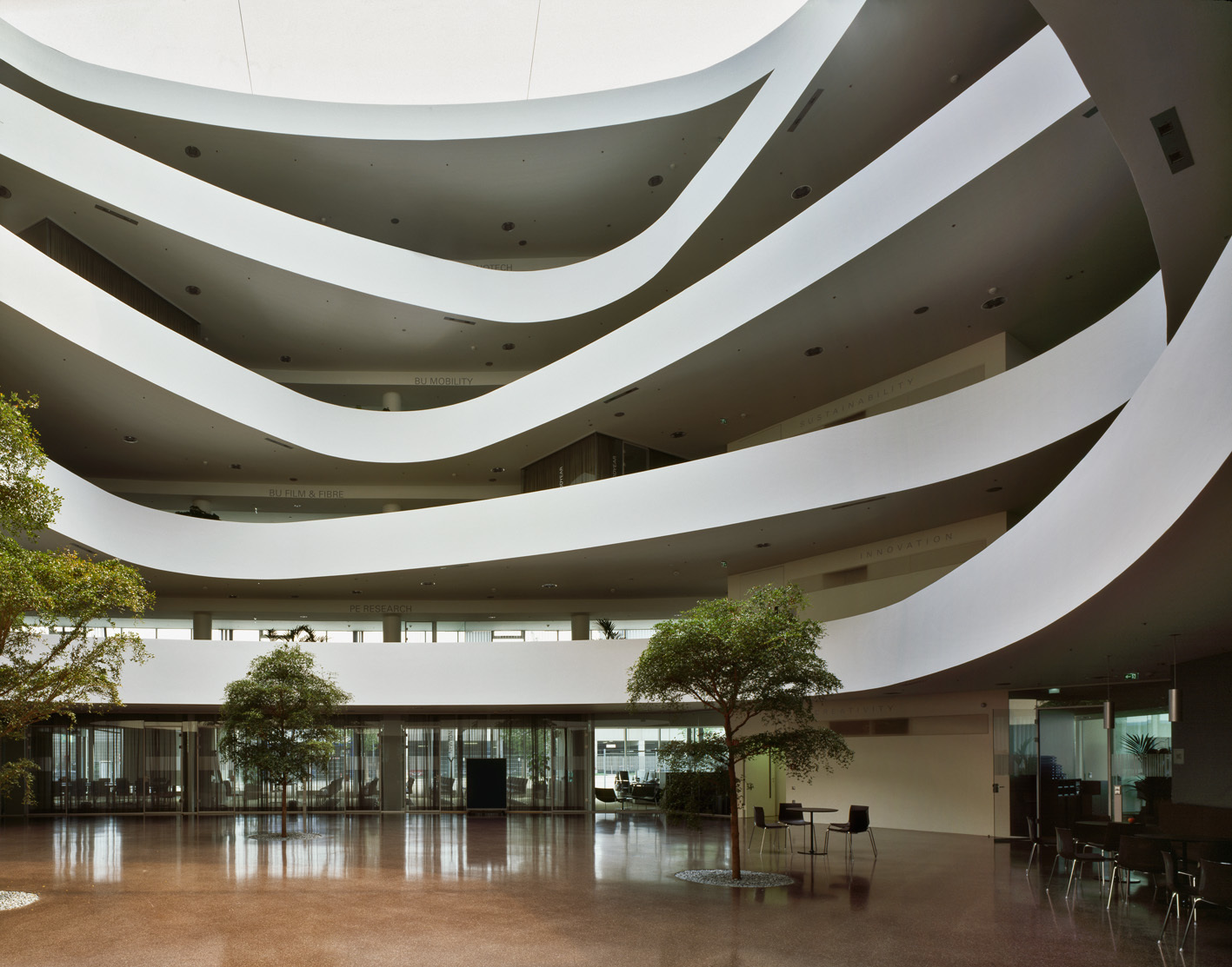 Als das Unternehmen Ende 2007 einen Wettbewerb für sein neues „Innovation Headquarter“ auslobte, war klar, dass dieses Gebäude optimale Voraussetzungen vor allem für die Zusammenarbeit von Forschern bieten sollte. Das Siegerprojekt von Henke und Schreieck verfolgt in dieser Hinsicht einen radikalen Ansatz: Anstelle der üblichen Zellen- oder Gruppenbüros bietet es eine Großraumlösung an, die alle Arbeitsebenen auch in der Vertikalen durch ein Atrium verbindet, das den Blickkontakt zwischen sämtlichen Business Units ermöglicht. Es gibt im gesamten Gebäude kein Einzelbüro mehr, selbst die Chefs haben ihre Schreibtische im Großraum.