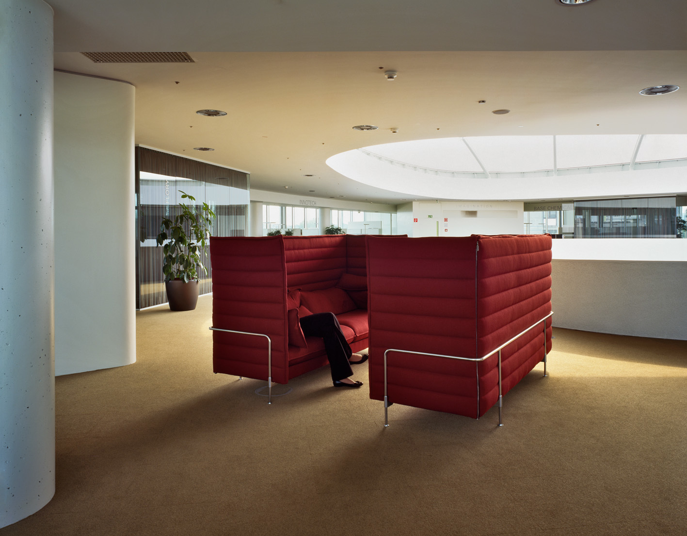 In Kombination mit versetzt angeordneten raumbildenden Elementen – Glasboxen für Besprechungen, Sanitärbereichen, Fluchttreppen und offenen Kaffe- und Besprechungszonen – entsteht so ein differenzierter Großraum, in dem man sich wohl und gut aufgehoben fühlt. Dass dieser Raum auch akustisch funktioniert, hat einiges an Überlegung bedurft. Akustikdecken konnten nicht eingesetzt werden, da die zur Kühlung nötige Bauteilaktivierung weder abgehängte Decken noch Akustikputze zuließ. Teppichböden sind daher in allen Obergeschoßen selbstverständlich, aber auch die meisten Möbel sind aus speziellen, mit feinen Bohrungen versehenen schallschluckenden Platten hergestellt. Und selbst die Espressomaschinen in den Kaffeezonen sind keine Standardprodukte, sondern spezielle Geräte mit Schalldämpfern.
