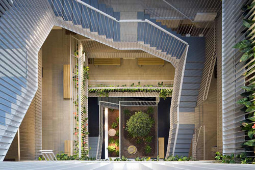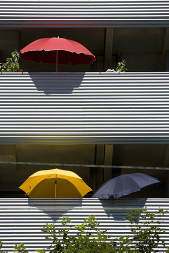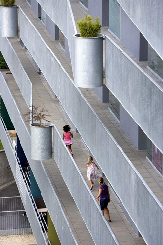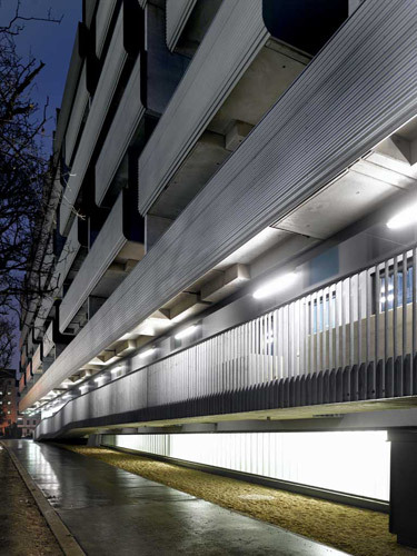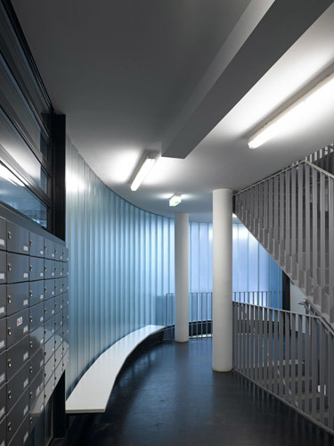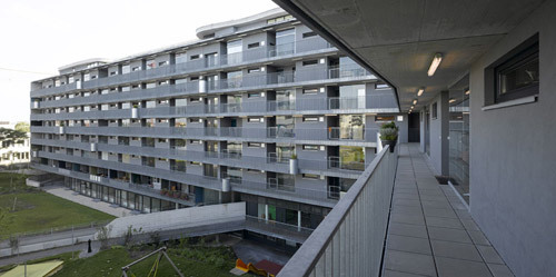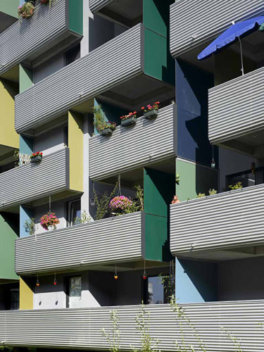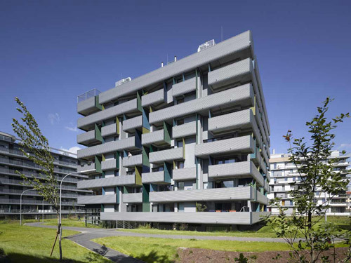 Die drei freistehenden Punkthäuser im Bauteil C wurden von Elsa Prochazka entworfen, die zweigliedrige Konfiguration des Bauteil D von querkraft architekten (siehe gesonderte Einträge). Mit dem Bauteil E von Geiswinkler & Geiswinkler findet das durchgrünte Ensemble der Punkthäuser durch eine L-förmige Randbebauung einen rahmenden Abschluss. Der straßenbegleitende Baukörper mit gartenseitiger Laubengangerschließung (101 Wohneinheiten, 16 Wohnungstypen) ist im Bereich der Hauptstiegenhäuser durchlässig und verbindet die dahinter liegende Stadtvilla (59 Wohneinheiten, 8 Wohnungstypen) mit dem Stadtraum. Den Wohnungen ist ein teilweise 2-geschosshoher Vertikalgarten vorgeschaltet, ein Prinzip der räumlichen Aufwertung einer Loggia, das die Architekten bereits in früheren Wohnprojekten erfolgreich angewandt haben. Die mit Wellblech bekleideten Brüstungen sind über die Unterkante gezogen, was die Räumlichkeit dieser Freibereiche verstärkt. Durch das Anheben der Baukörper und ein durchdachtes System aus Rampen, Laubengängen und Brücken werden die privaten Freibereiche geschützt und die Gemeinschaftseinrichtungen im Zwischengeschoss natürlich belichtet. (Text: Gabriele Kaiser)