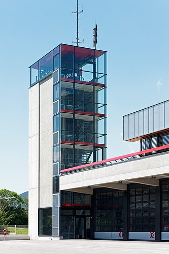 Dominanter Bauteil des zum Fluss und zur Promenade hin abgestuften Volumens ist der 18 m hohe, gläserne Schlauchturm, der die Funktion dieses, von der Autobahn kommend ersten Gebäudes der Stadt, von weitem sichtbar macht. Über den Feuerwehrturm laufen die Schlauchtrocknung, die gesamte Haustechnik und die Kommunikation, in die Fassade integriert wurden Sonnenkollektoren. Eine 16 Meter hohe Kletterwand sowie die für Abseilübungen nutzbare Außenmauer aus Sichtbeton runden das Funktionsangebot ab.