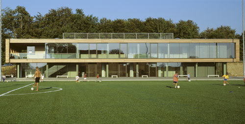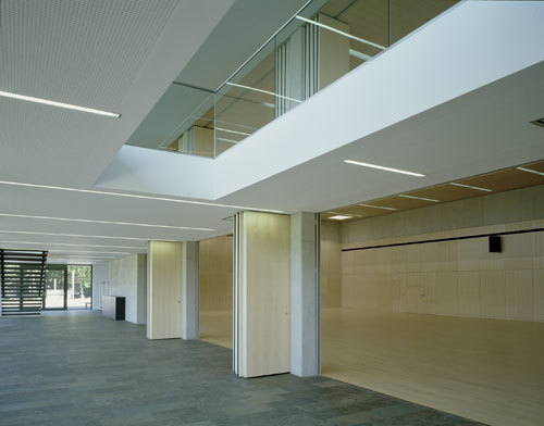 Die Halle selbst ist eigentlich nur ein großer Hohlraum, der auf zwei Ebenen mit einem Kranz aus Erschließungsflächen und Foyers umgürtet ist. Eine natürliche Geländestufe – das Spielfeld liegt um 4 m höher als die Zugangsebene – ermöglicht, dass über die Terrasse des Obergeschosses ein fließender Übergang in die Landschaft entsteht. Das dem Veranstaltungssaal vorgelagerte Foyer mit seinem charakteristischen Holzrahmen öffnet sich über raumhohe Verglasungen Richtung Westen und bietet den Besuchern in den Veranstaltungspausen atemberaubende Ausblicke in die Landschaft. (Text: Roman Höllbacher)