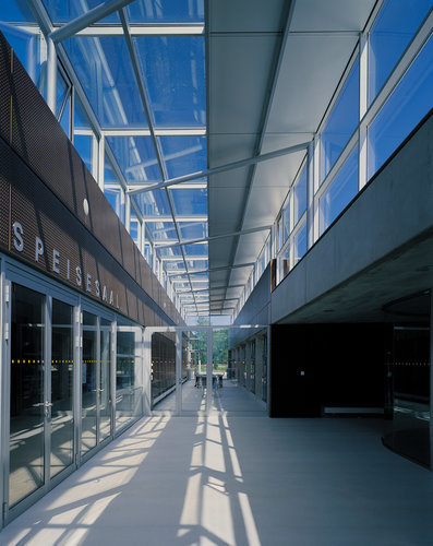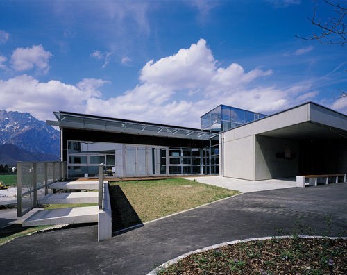 Der Neubau schließt den gewachsenen Gebäudekomplex der Landwirtschaftsschule, die nach und nach um den alten, auf einer Geländestufe gelegenen Ansitz Winklhof entstand, nach Westen ab. Er ist so situiert, dass im Zusammenspiel mit den bestehenden Schulgebäuden ein neuer großzügiger Platz entstand. Während die behäbigen Bestandsbauten durch mächtige Walm- oder Satteldächer gekennzeichnet sind, schlägt diese jüngste Erweiterung formal einen anderen Ton an. Glas, Sichtbeton und rotbraune Panelle bestimmen das Erscheinungsbild des flachen, lang gestreckten Baukörpers. Er setzt sich aus zwei Trakten zusammen, die über eine von oben natürlich belichtete Erschließungsachse miteinander verbunden sind. Die Turnhalle wurde um zwei Meter gegenüber dem Erdgeschossniveau abgesenkt, was den Vorteil hat, dass sie in der Ansicht nicht dominant in Erscheinung tritt. Außerdem konnte so niveaugleich eine direkte Verbindung zum Untergeschoss des Schulgebäudes geschaffen werden. (Text: Roman Höllbacher)