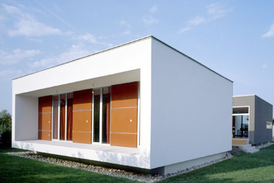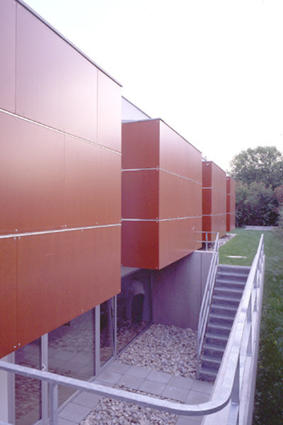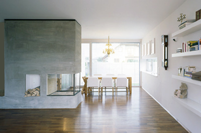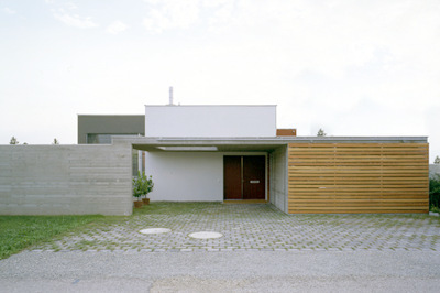 Das Grundthema der Bebauung ist eine grösstmögliche Verflechtung von Innenraum und hauseigener „Umgebung“: Wohntrakt und Schlaftrakt sind als eigenständige Baukörper formuliert, die durch eine Erschließungsachse miteinander verbunden wurden, in welche wiederum vier Nebenraum-Sperrholzboxen einschoben sind, die das Gefüge räumlich rhythmisieren. Zwischen dieser losen Verkettung funktionaler Einheiten erstrecken sich fünf differenzierte Aussenräume: ein überdachter Vorplatz, eine Frühstücksterrasse, ein dem Wohnraum zuwachsender Wohnhof, eine rückseitige Veranda sowie ein dem Wohnkeller zugehöriger Lichthof. Das klassische Thema des Hauses als Weg und Platz ist auf eindrückliche Weise umgesetzt. Zwischen den Sperrholzboxen entstanden mehrere Nischen – ideale Kojen für die wirkungsvolle Positionierung der Antiquitäten des Bauherren. (Text: Gabriele Kaiser, 02.10.2003)