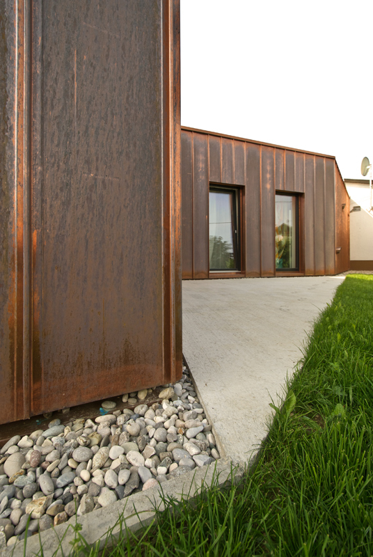 Die Offenheit der Bauherren ermöglichte es uns ohne Zwänge an den Entwurf herangehen zu können. Daraus entwickelte sich eine sehr eigenwillige und unorthodoxe Projektidee, bei dem der Zubau als eingeschossiger Baukörper konzipiert wurde, der die Vorzüge eines Hotelzimmers mit den Vorteilen des Einfamilienhauses in sich vereint und als eigenständiges Gebäude funktioniert. Wichtige Parameter für die Form des Grundrisses waren der Sonnenverlauf, die inneren Raumabfolge und der Wunsch nach zwei privaten aber unterschiedlichen Terrassen. Aus diesen Gründen vollzieht der Baukörper gleich zweimal eine Richtungsänderung, an deren Knickkante sich die 2 Terrassen herausbilden. Die Winkel der Richtungsänderungen sind nicht beliebig sondern in Abhängigkeit des Sonnenverlaufes, um eine optimale Besonnung zu gewährleisten. Ebenso ist auch der funktionale Ablauf der Innenräume mit den Terrassen und dem Sonnenverlauf abgestimmt. Somit tritt die Grundrisskomposition als Spiegelbild des Tagesablaufes in Erscheinung. Die Fassaden thematisieren das „in Würde Altern“. Der Holzbau wurde mit Kupferbahnen eingekleidet, welche über die Zeit eine Patina anlegen. Kombiniert wird das Kupfer mit Holz, das naturbelassen vergrauen wird, sowie mit Besenstrich behandelten Betonflächen. Die Reinheit der Materialien bringt eine Archaik zum Ausdruck, der die Sinne anspricht. (Text: Architekten)