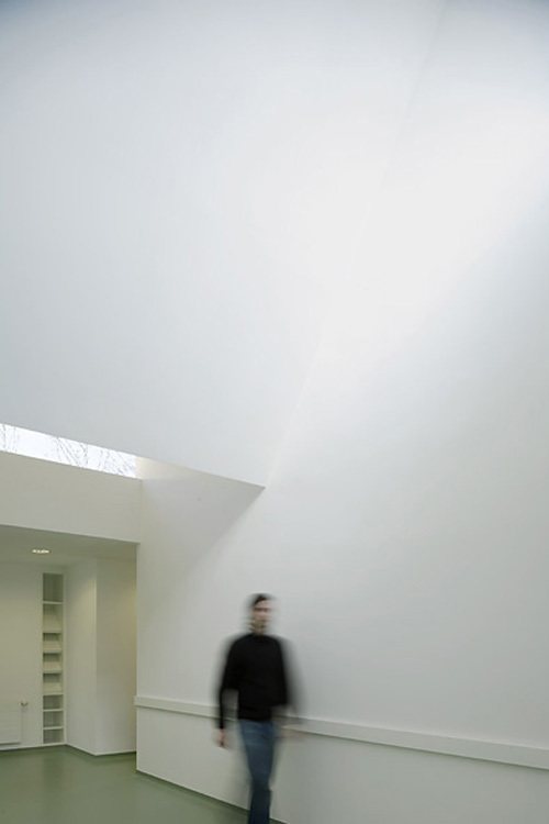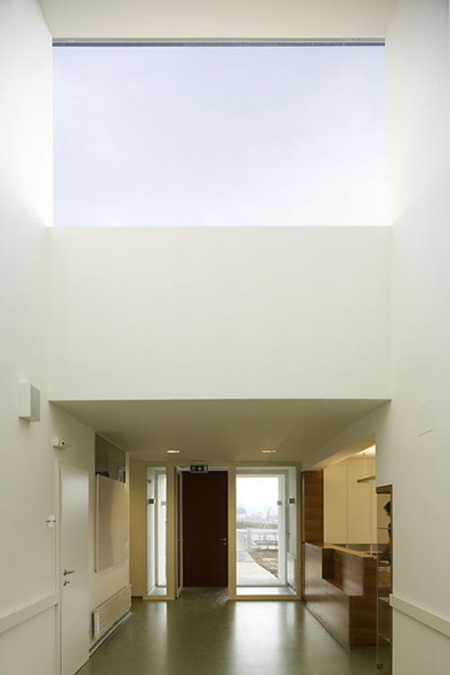 Man betritt das Gebäude über eine kurze Rampe, welche in ihrer Verlängerung in den Wartebereich mündet. Belichtet wird diese zentrale Zone durch zwei markant aufragende Oberlichter, die auch das
