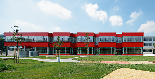 Im Herbst 2010 wurde der „Campus“ nach nur elf Monaten Bauzeit eröffnet. Das Gebäude nimmt, so wie der angrenzende Rudolf-Bednar-Park, die Richtung der Schienen auf: der Baukörper erstreckt sich auf fast 180 Meter Länge. Im Eingangsbereich bilden drei V-förmige Stützen ein städtebauliches Signal. Den Mittelpunkt des Gebäudes bildet der Speisesaal, der über drei Geschosse bis zum Glasdach durchgreift und von allen Ebenen einsehbar ist. Zahlreiche Vertikaldurchbrüche in Form von durchgestanzten, zweigeschossigen Atrien fördern den Lichteinfall und schaffen über den Tagesverlauf unterschiedliche Lichtstimmungen im Gebäude. Einige der Atrien sollen als Indoor-Gärten genutzt werden und auch Platz für Schildkröten bieten. Noch präsentiert sich das Gebäude, das erst seit wenigen Wochen den Betrieb aufgenommen hat, sehr nüchtern und pragmatisch. Mit Ausnahme der bunt gestalteten Türnischen und Nassräume wurde mit Farbe sparsam umgegangen, die Wände bieten ein neutrales Tableau für die Schülerarbeiten, die in naher Zukunft die Gänge zieren werden. Im Eingangsbereich begrüßt ein farbenfrohes Mosaik der Künstlerin Christina Gschwantner die Kinder.Künftig werden hier elf Kindergartengruppen und 17 Volksschulklassen untergebracht. Noch ist der Großteil des ehemaligen Nordbahnhofareals eine Baustelle, folglich wird am Campus erst ein Bruchteil der Klassen und Kindergartengruppen in Anspruch genommen. Mit jedem weiteren fertig gestellten Wohnhaus wird auch die Anzahl der Kinder hier am Campus zunehmen. Das neuartige Konzept des „Campus“ sieht vor, dass Kindergartenkinder und Volksschulkinder gemeinsam das Raumangebot nutzen und sich frei bewegen können, das gilt auch für den Gartenbereich, der vom Obergeschoss über eine Freitreppe begehbar ist. Gartenseitig wurde die Fassade mit erkerartigen Einschnitten kleinteilig gegliedert. Die Erker ermöglichen mit ihren niedrigen Fenstern für die Kindergartenkinder Blickkontakt zu den benachbarten Gruppen. Große Freibereiche für Projektunterricht, neues Lernen und Ateliers runden das Raumangebot ab.